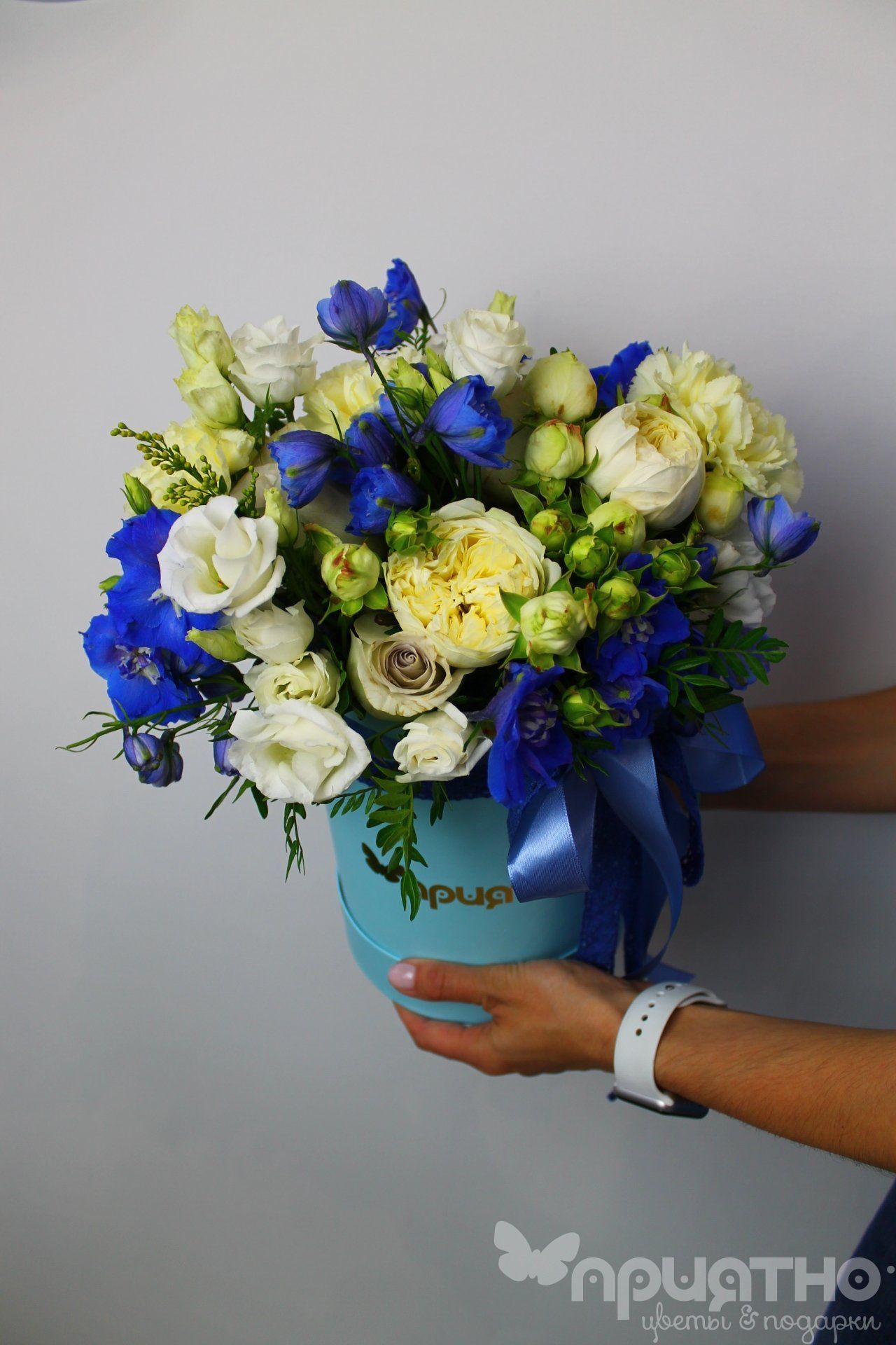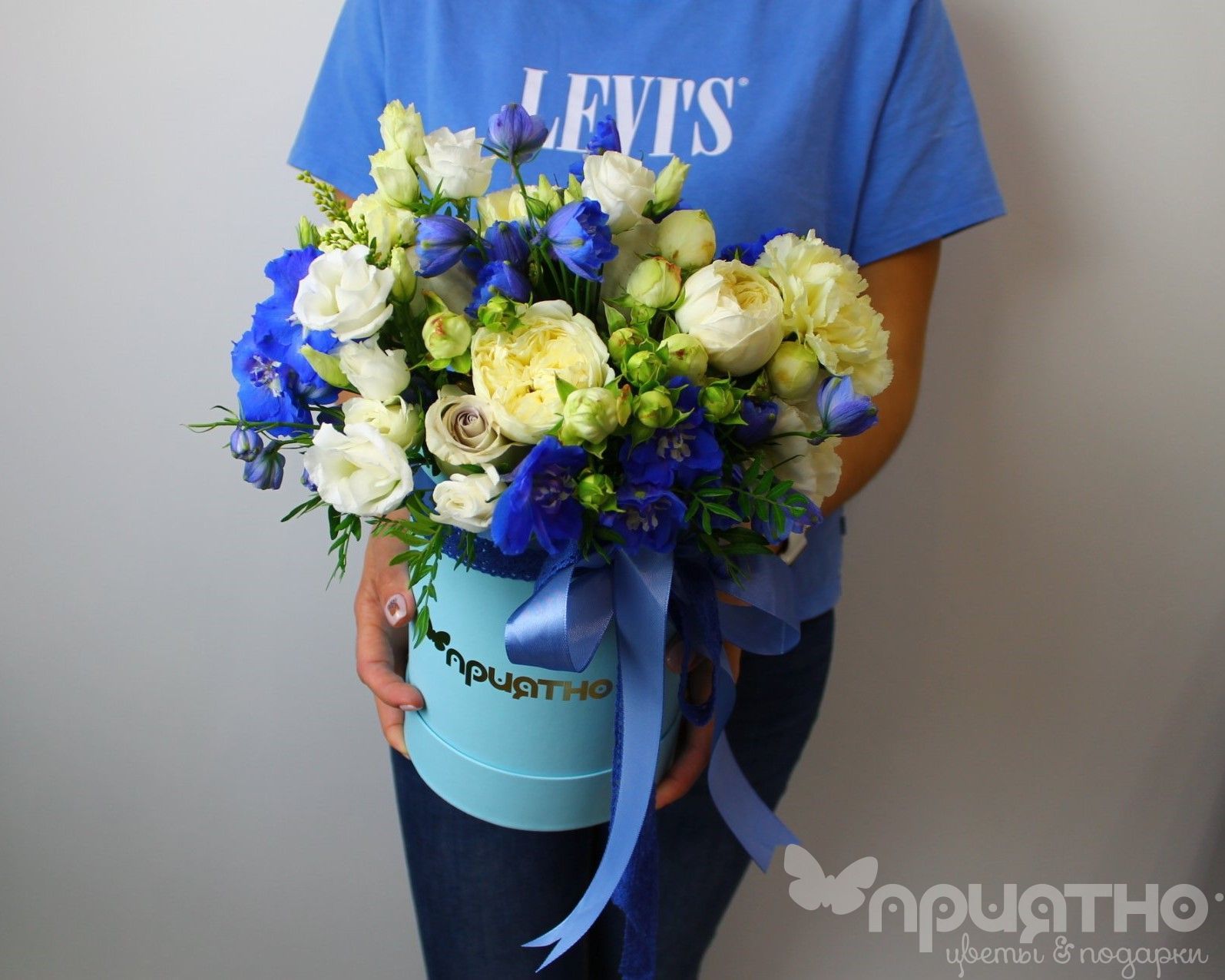 Такой подарок привлечет восхищенные взгляды, а голубая шляпная коробка, в которую помещена композиция, придаст композиции еще больше яркости и нежности в тот же момент.