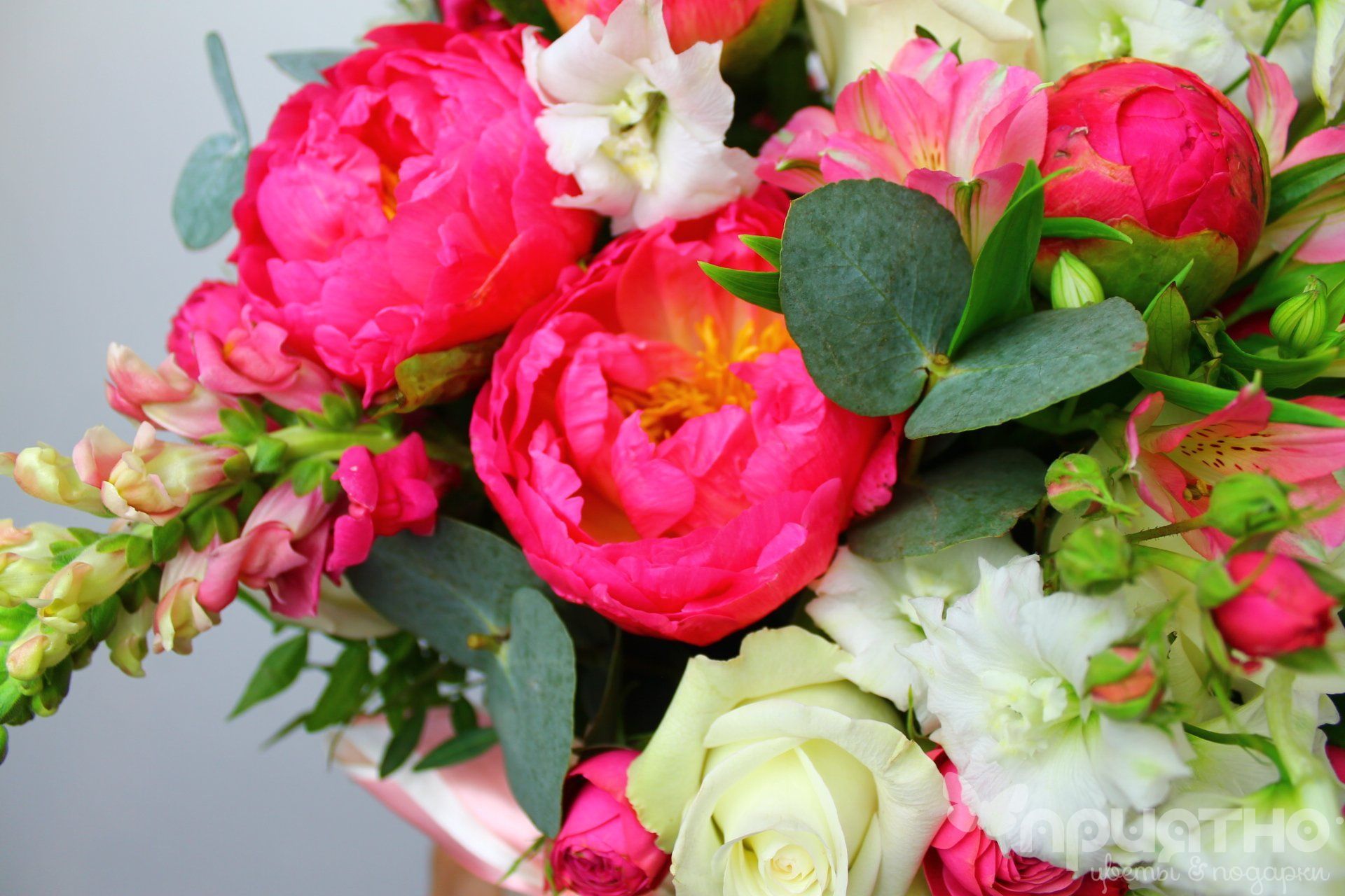 Ни одна девушка не устоит перед этой пышной композицией с пионами, классической розой, хрустальной эустомы и акцентами из листьев эвкалипта и дельфиниумом!