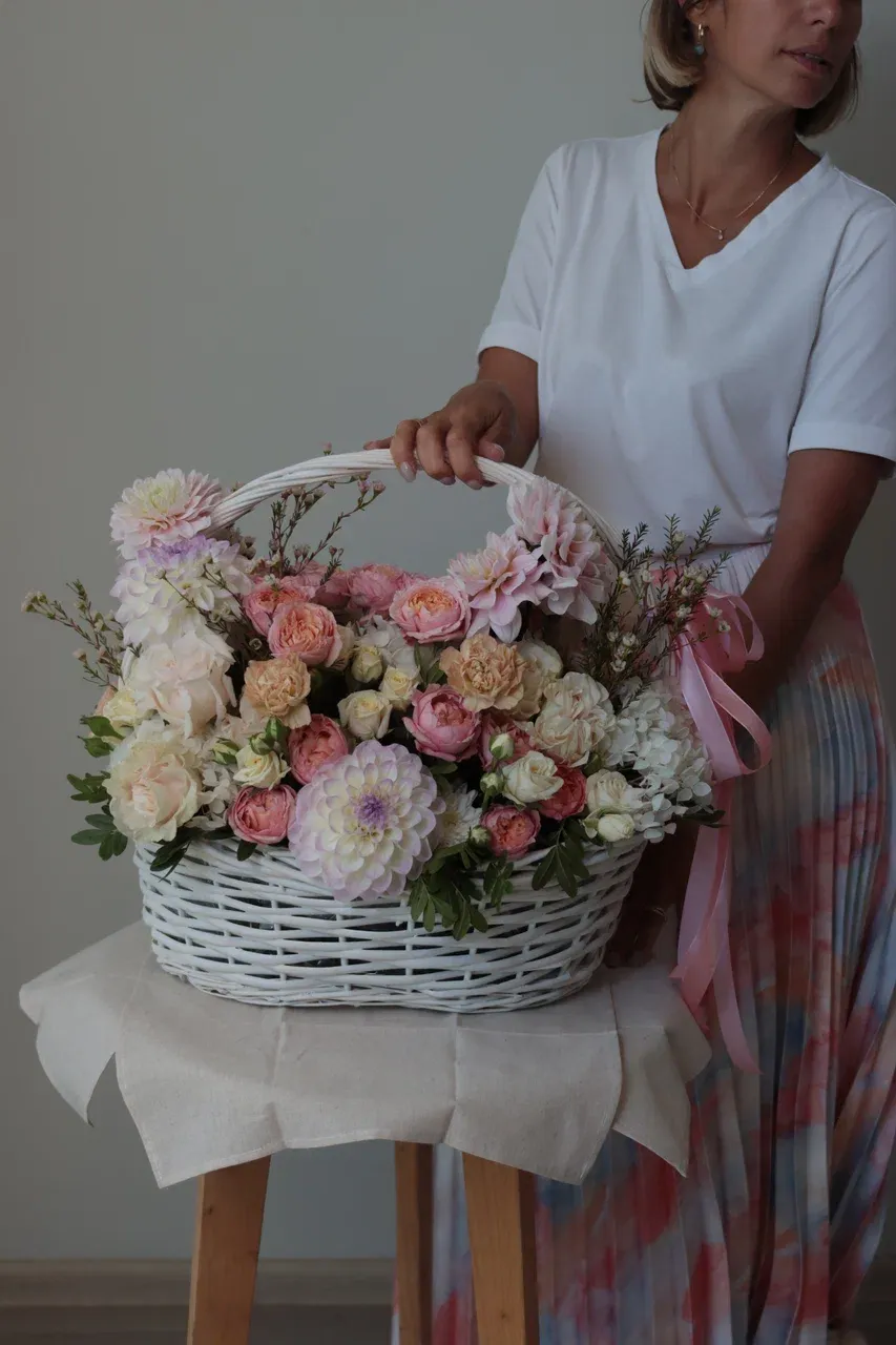 Откройте для себя магию нашей эксклюзивной цветочной композиции в декоративной корзине белого цвета! Созданная из нежных розовых, белых и персиковых оттенков, эта композиция станет идеальным выбором для любого события – будь то день рождения, юбилей, свадьба или просто желание порадовать себя и своих близких. Благодаря стильной упаковке и долговечной флористической губке, цветы сохранят свою свежесть и красоту на долгое время, обеспечивая радость и уют в вашем доме. Не упустите возможность подарить незабываемые эмоции с нашей цветочной композицией в декоративной корзине!