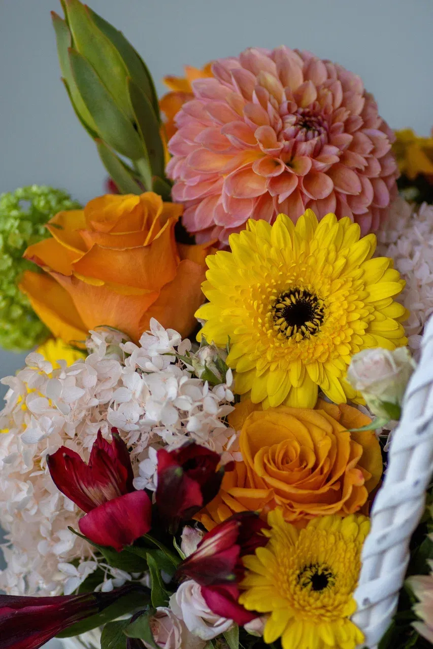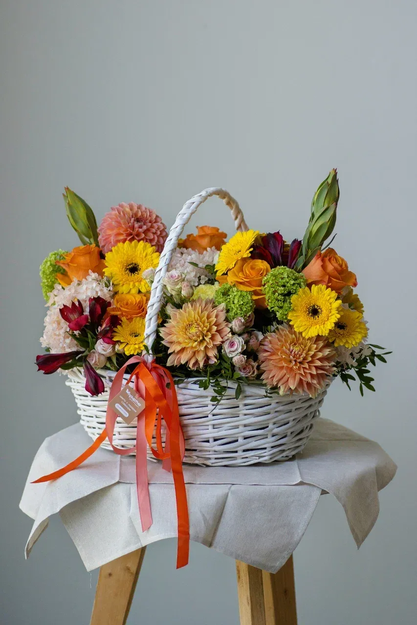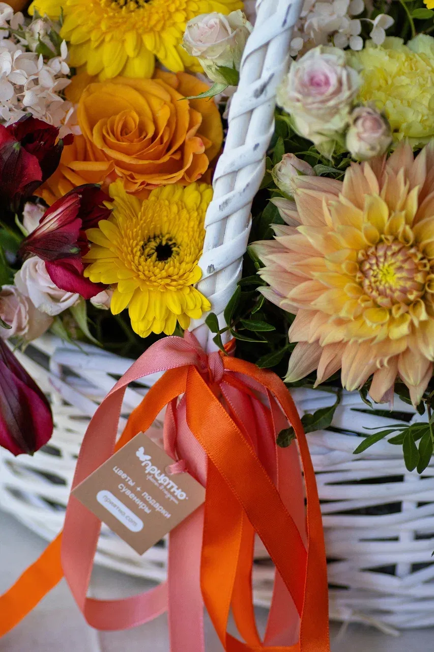 Откройте для себя мир ярких красок и эмоций с нашей эксклюзивной цветочной композицией в декоративной корзине белого цвета! Созданная из ярких, рыжих, жёлтых и зелёных оттенков, эта композиция станет идеальным выбором для любого события – будь то день рождения, юбилей, свадьба или просто желание добавить уюта в свой дом. Благодаря стильной упаковке и долговечной флористической губке, цветы сохранят свою свежесть и красоту на долгое время, радуя вас и ваших близких.