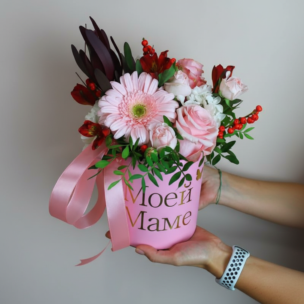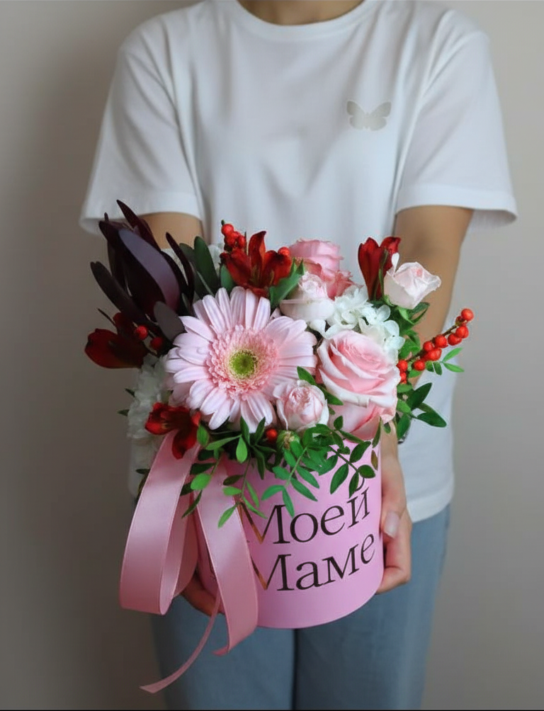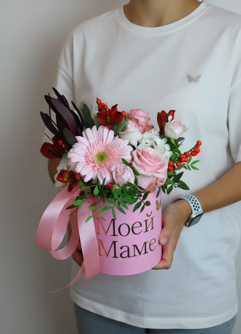 Изысканная цветочная композиция в нежно-розовой шляпной коробке с элегантной надписью "Моей маме". Розовые оттенки символизируют нежность, любовь и заботу, создавая настроение тепла и радости.