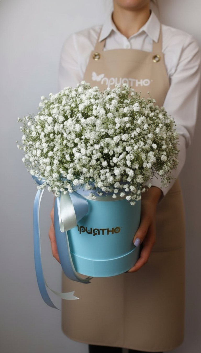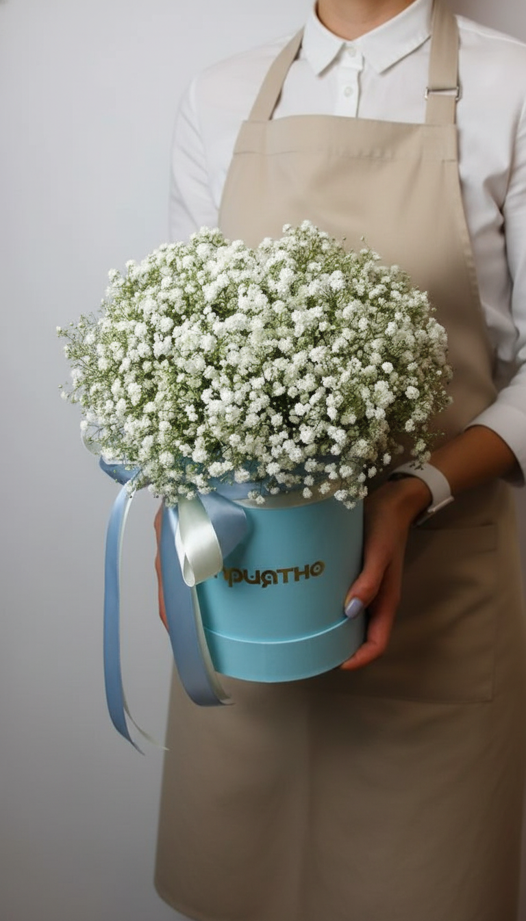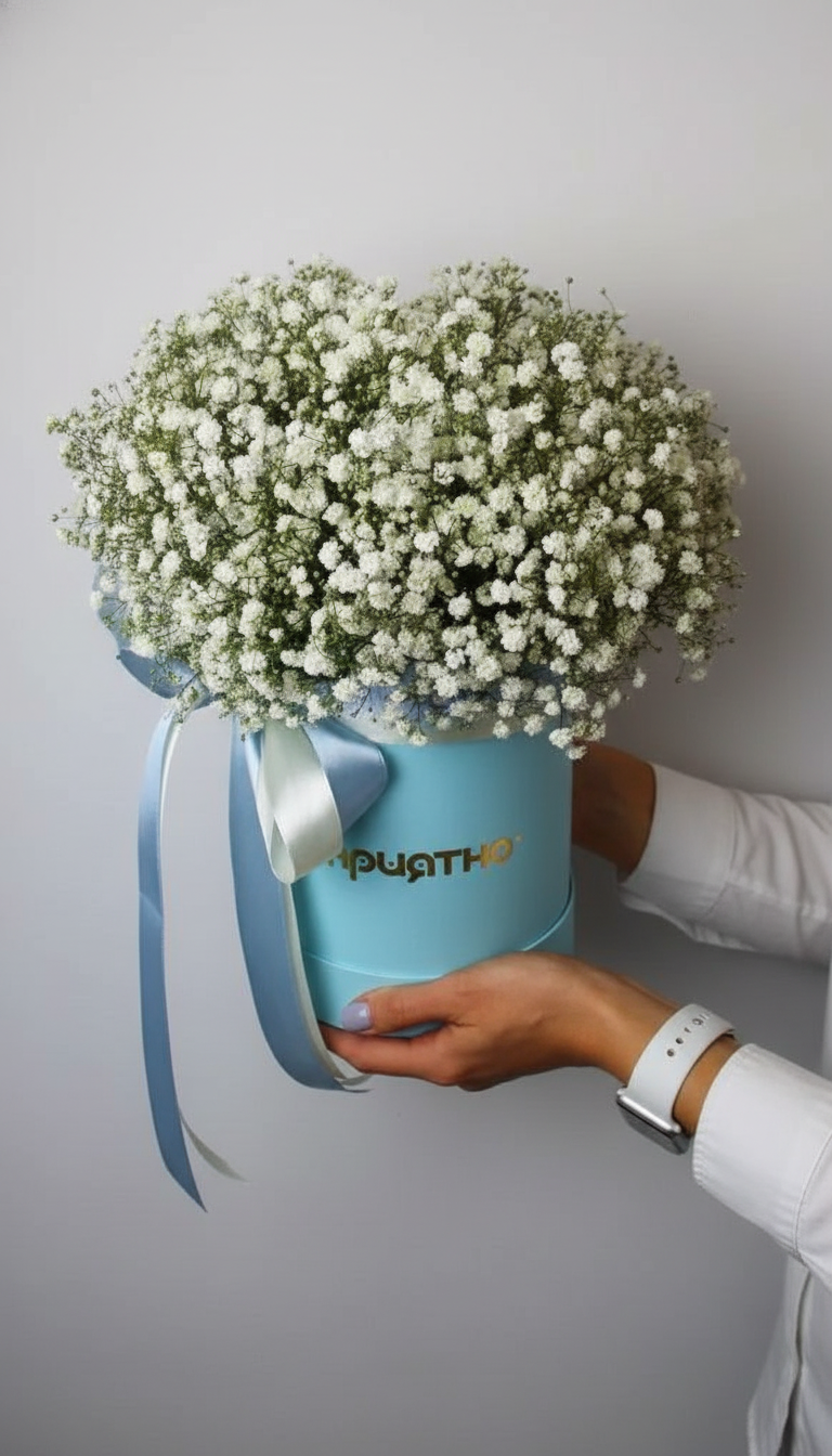 Изысканная композиция в шляпной коробке небесно-голубого цвета, где пушистая белая гипсофила создает образ лёгкого летнего облачка. Эта хрупкая красота станет воплощением вашей нежности и любви к маме.