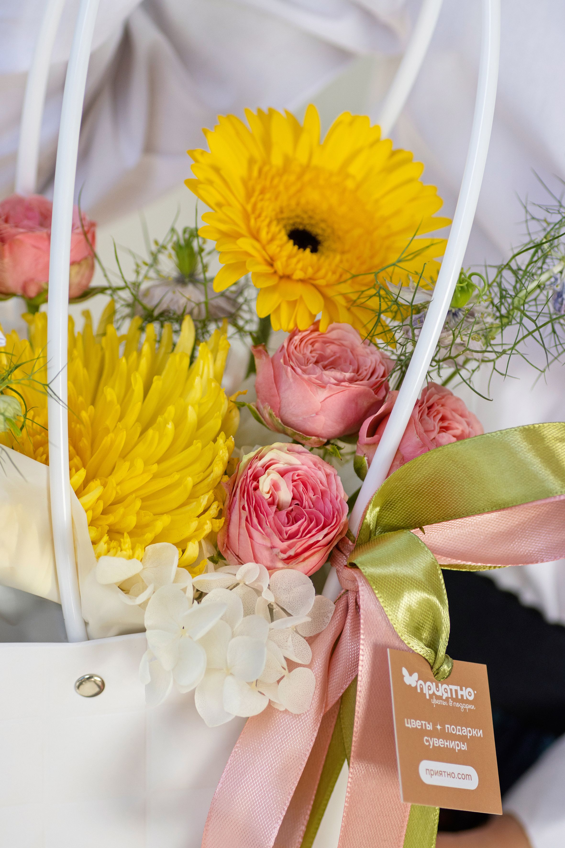Букет состоит из премиальной сортовой розы, кустовой розы, герберы, хризантемы, нигеллы, гортензии и сортовой гвоздики. Эти цветы являются символом радости, счастья и благодарности.