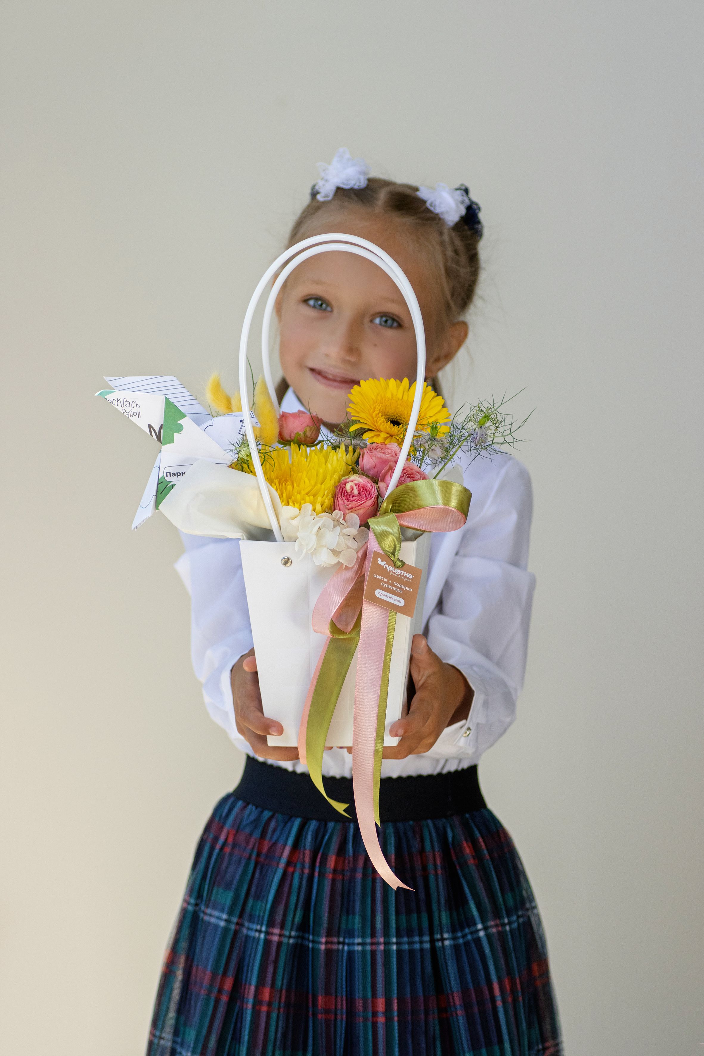 Ищете яркий и красивый букет для 1 сентября или Дня учителя? Наша компактная композиция в бело-жёлтых оттенках станет прекрасным выбором. Она сочетает в себе красоту и нежность, а также подарит получателю заряд позитива и энергии.