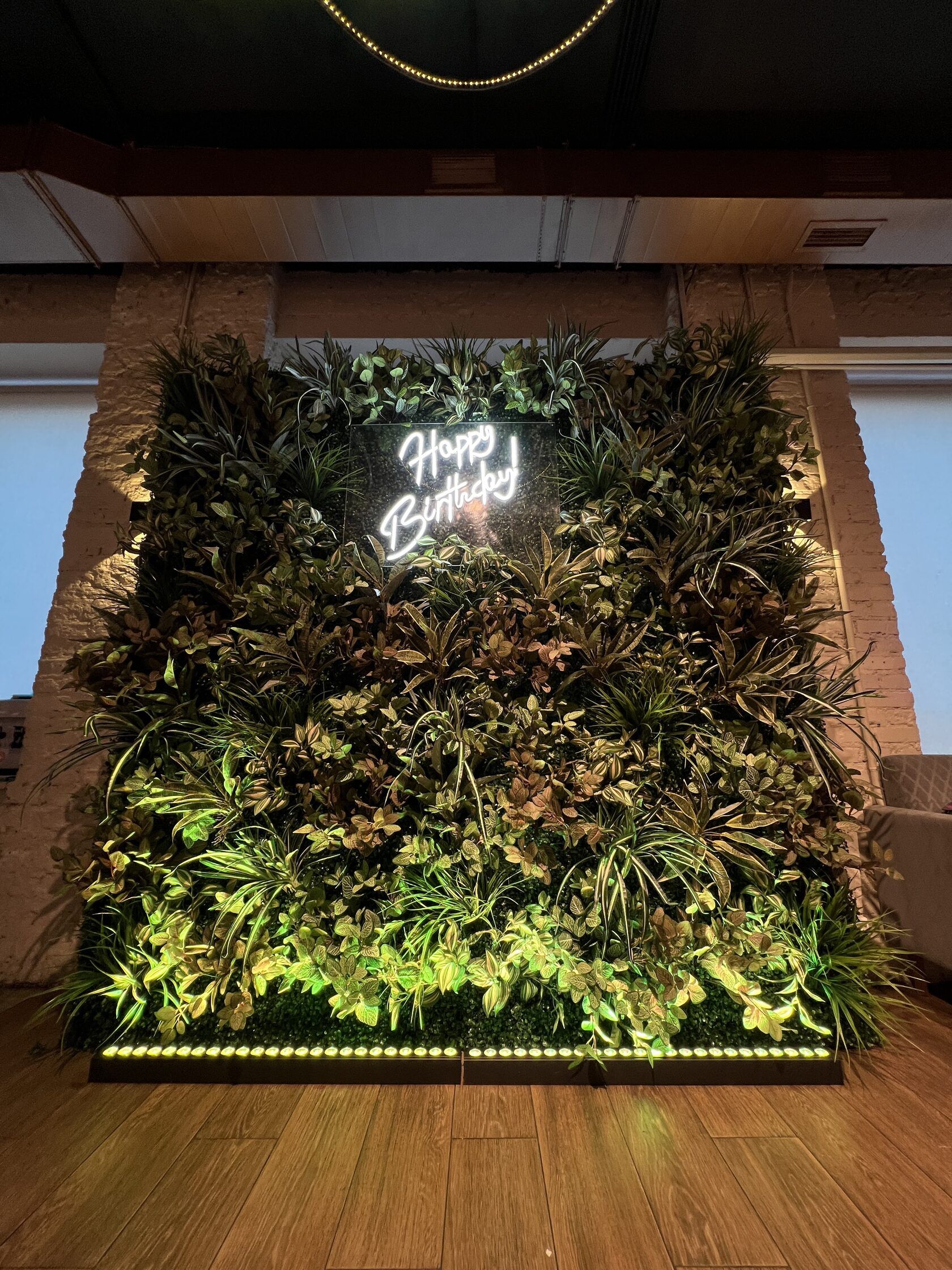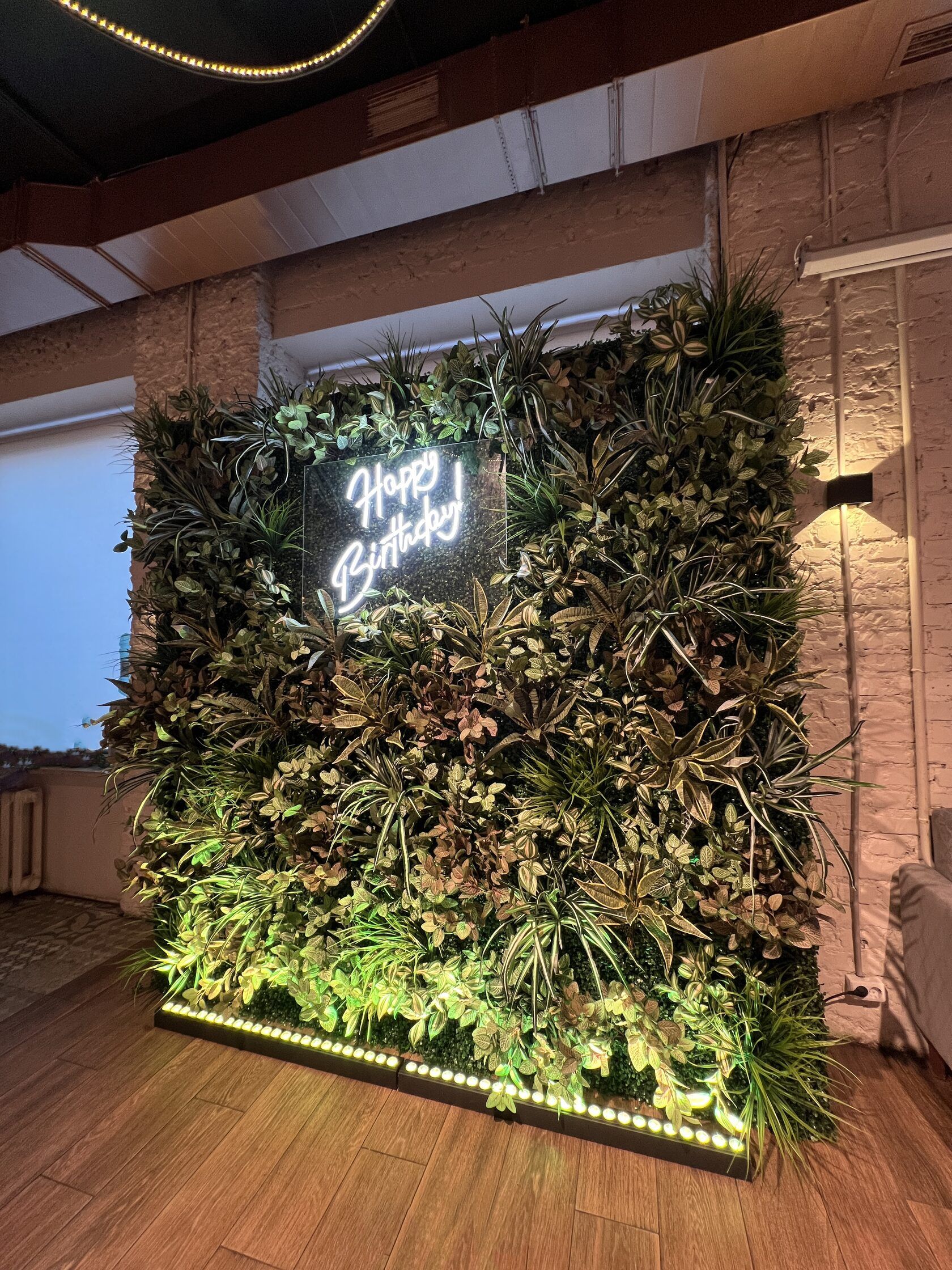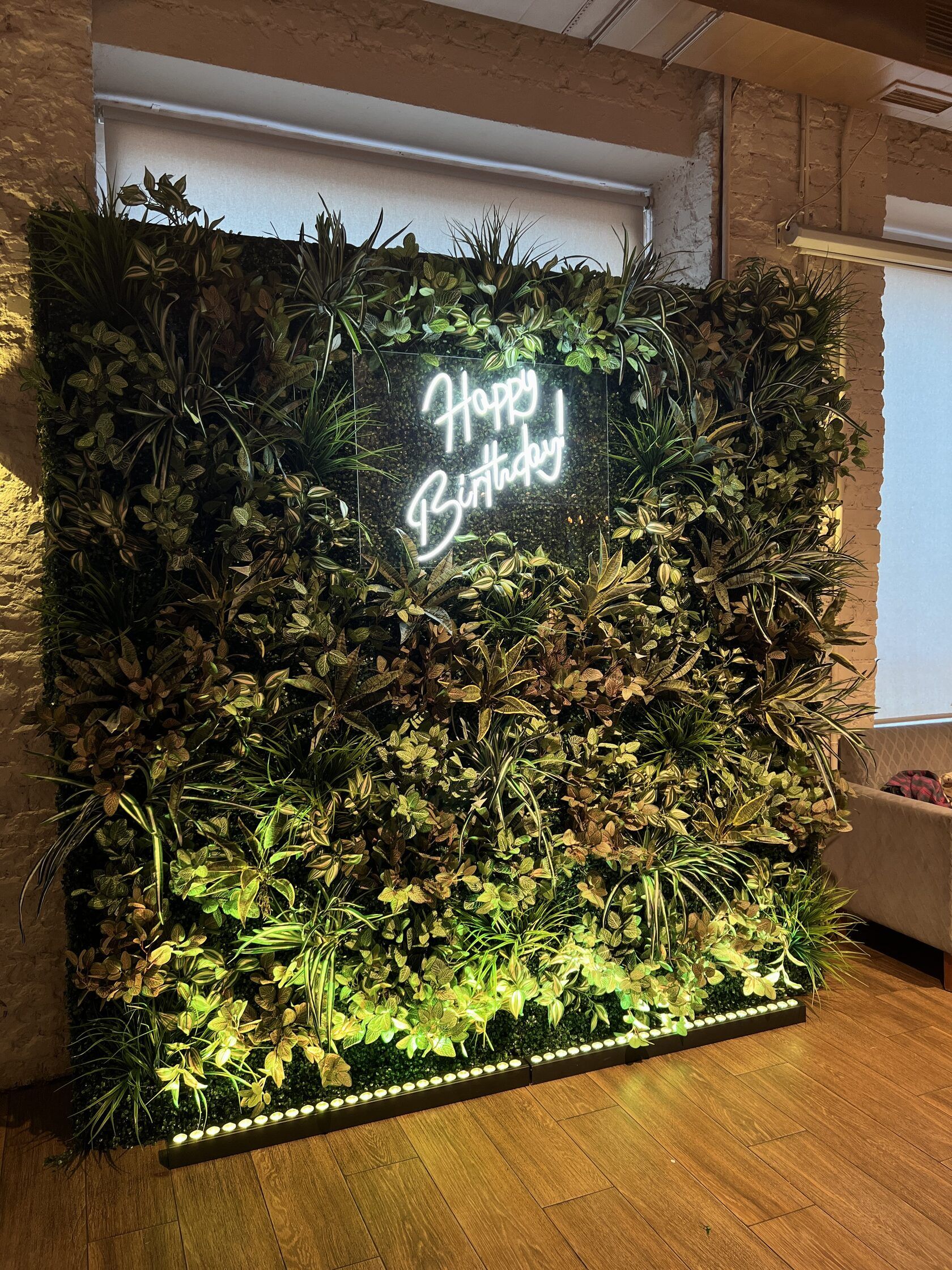 Подарите имениннику настоящую зеленую сказку! Наша роскошная фитостена с декоративными растениями и неоновой подсветкой станет идеальным фоном для памятных фотографий и создаст неповторимую атмосферу праздника.