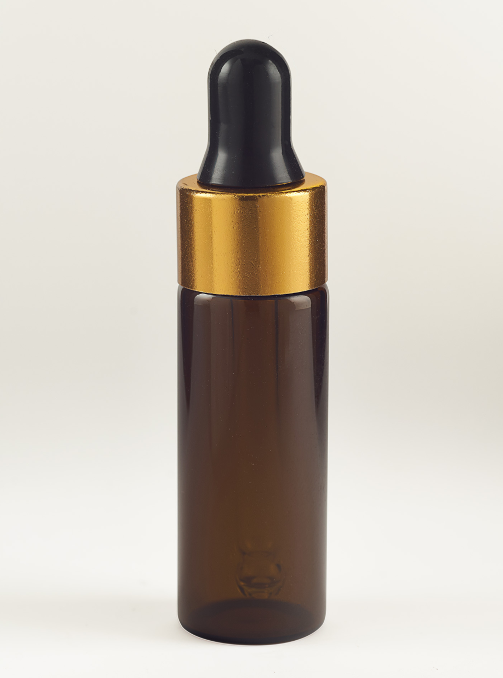 Стеклянный коричневый флакон (пробник) для аромадиффузора с черно-золотой крышкой и пипеткой.