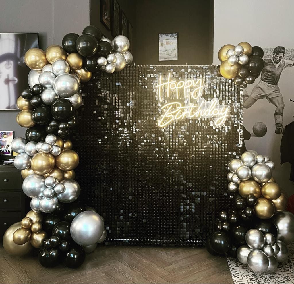 Фотозона из черных пайеток с гирляндой из шаров: Элегантность и Роскошь