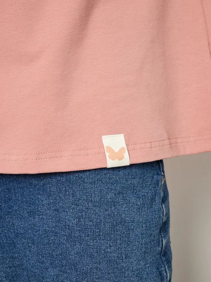 Цвет футболки - пудрово-розовый.