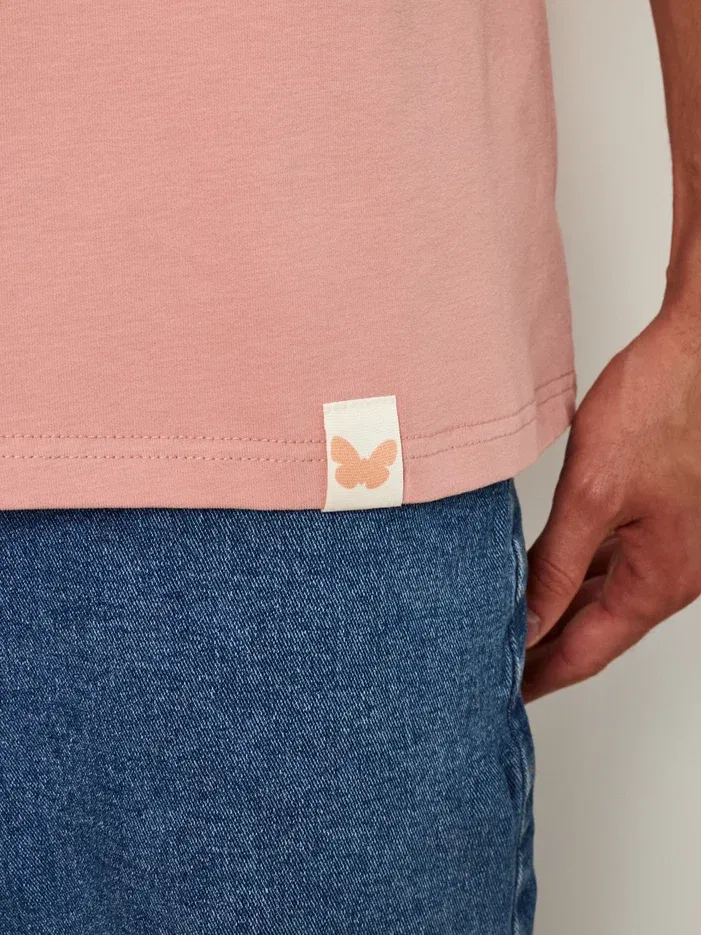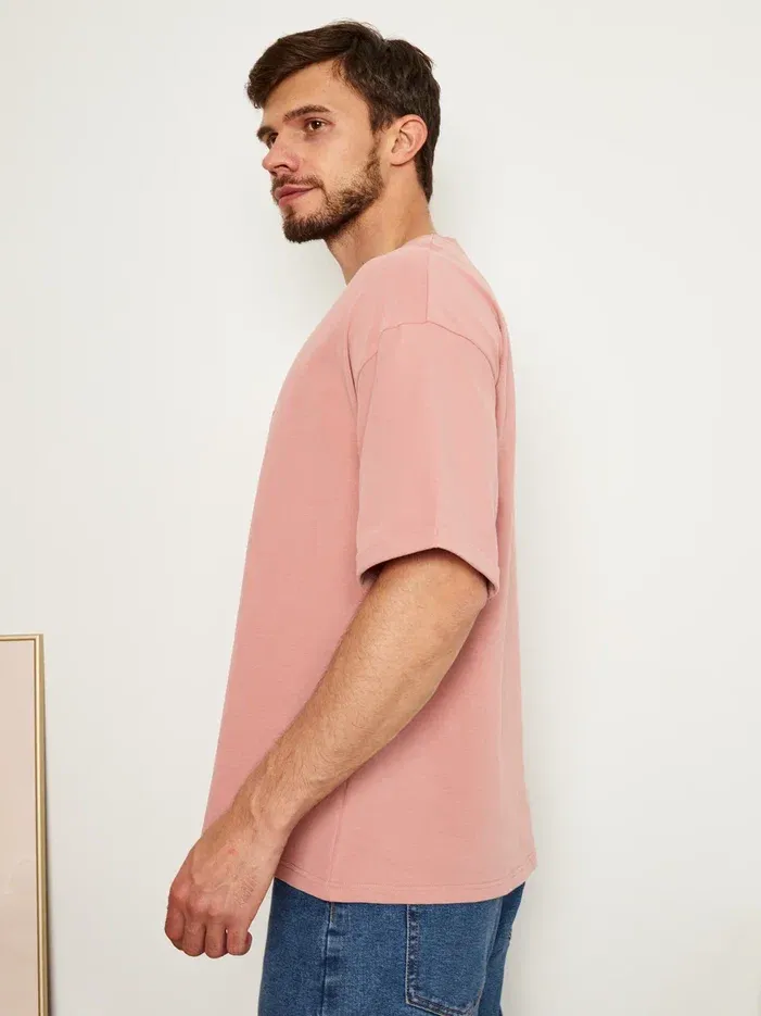 Цвет футболки - пудрово-розовый.