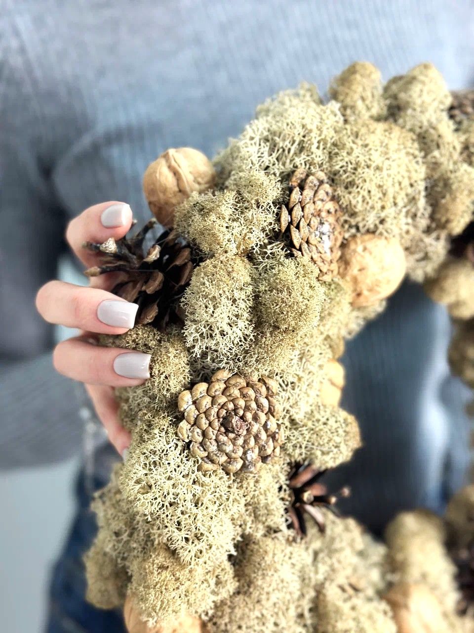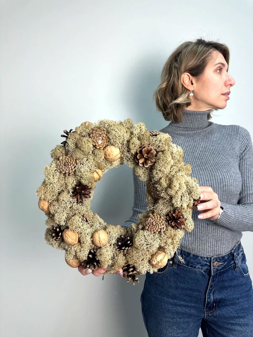 Зимний венок «Малая таёжная радость» — это стильный и оригинальный подарок, который придётся по вкусу любому. Она состоит из стабилизированного мха, декоратиных шишек и грецких орехов, которые создаёт неповторимый антураж и визуально украшают пространство.