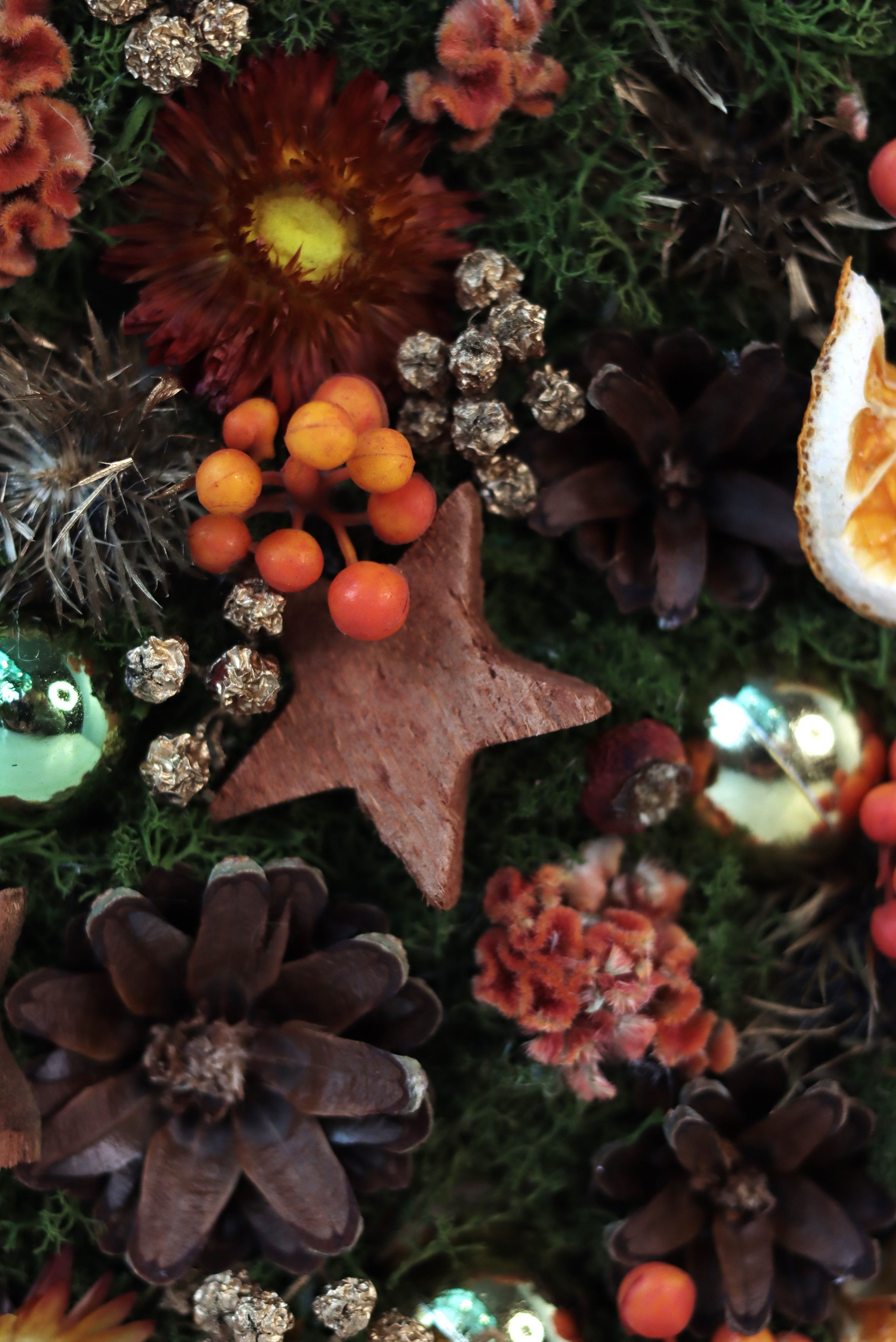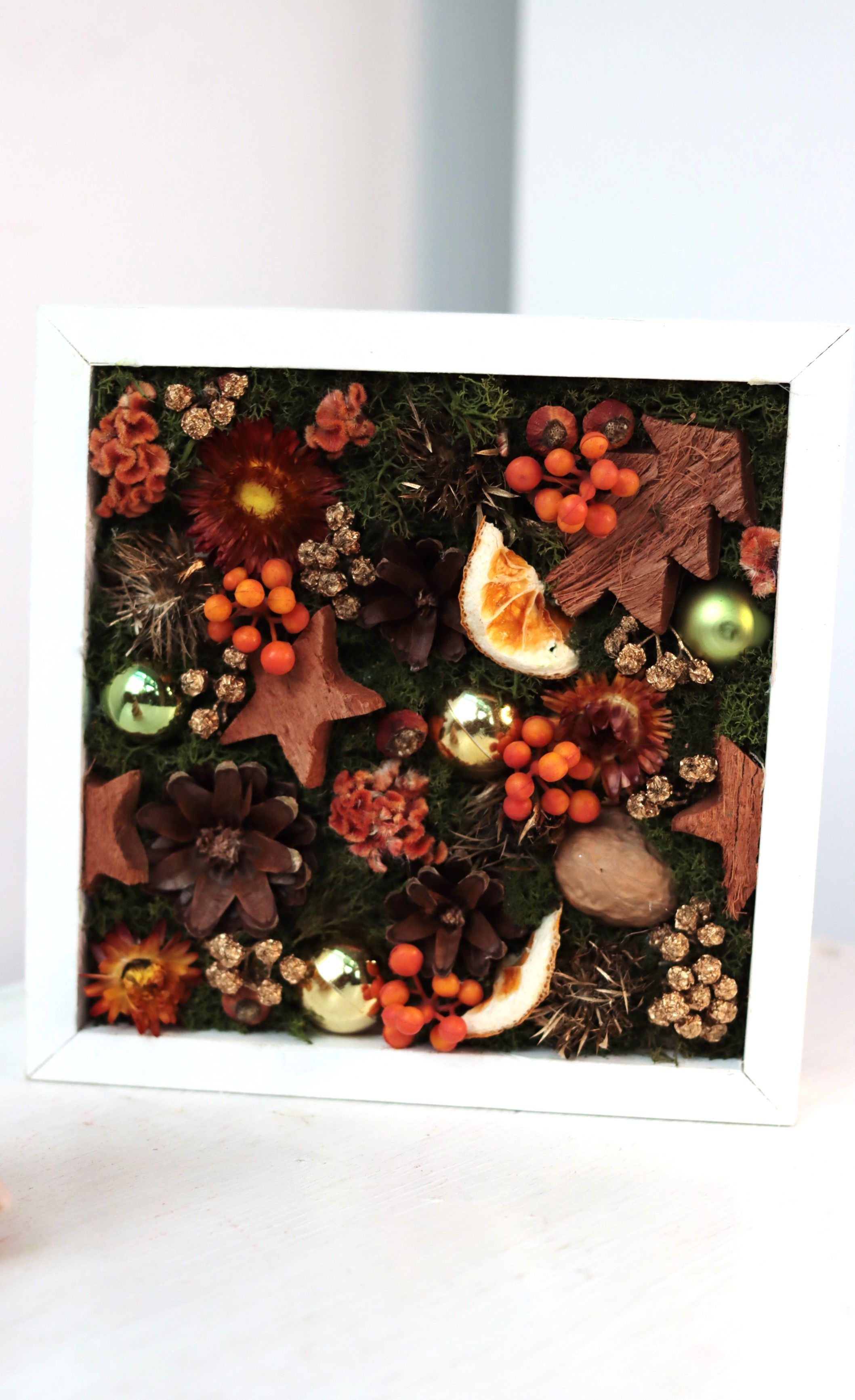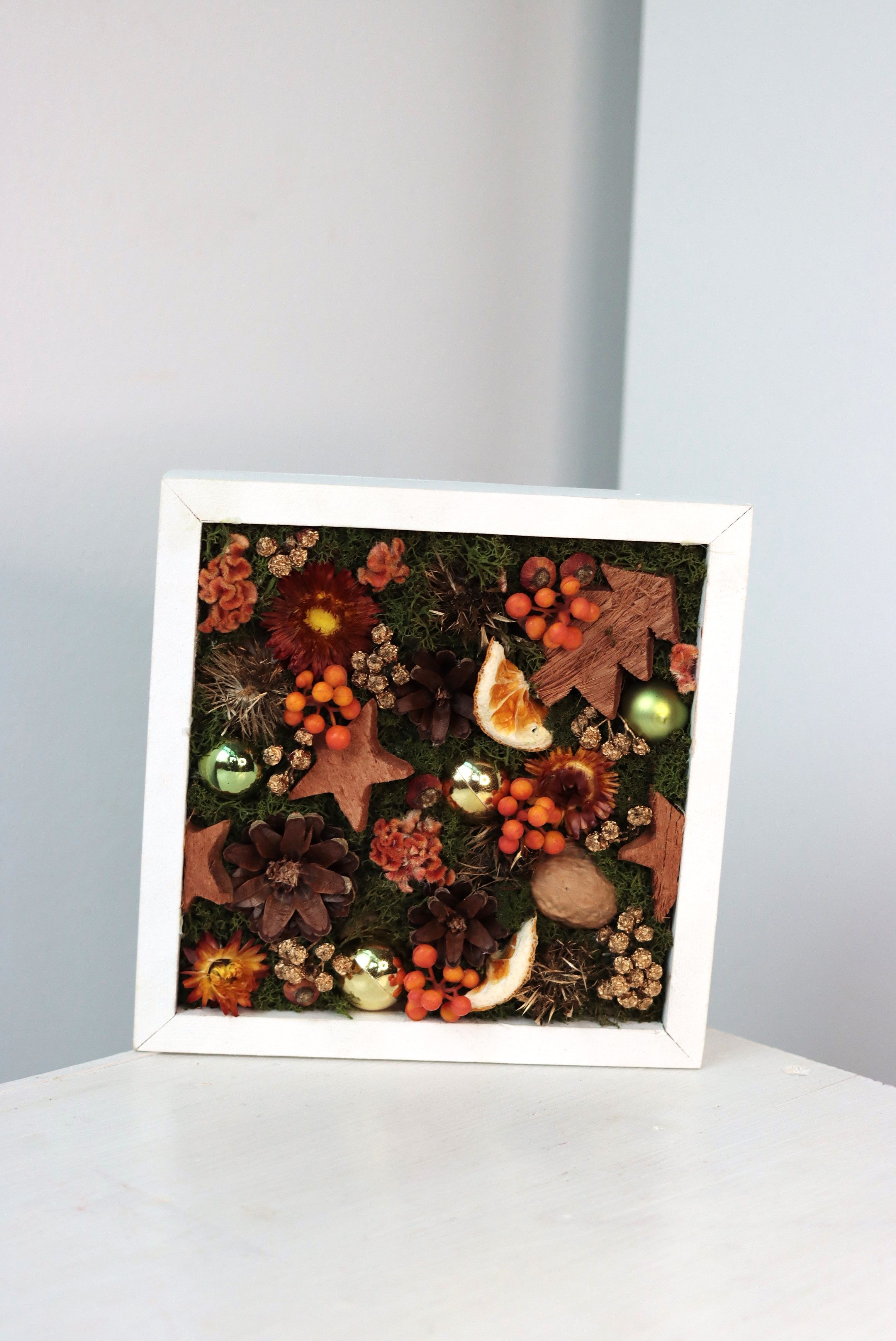 Новогодняя композиция в рамке — прекрасный подарок для ваших родных и друзей. В неё входят стабилизированный мох, ёлочные шары, декор из натуральной коры дерева, ароматные апельсины, яркие сухоцветы, а также деревянная рамка размером 20×20 см и оригинальный декор из кокоса. Мы предлагаем доставку этого чудесного подарка по всей России.