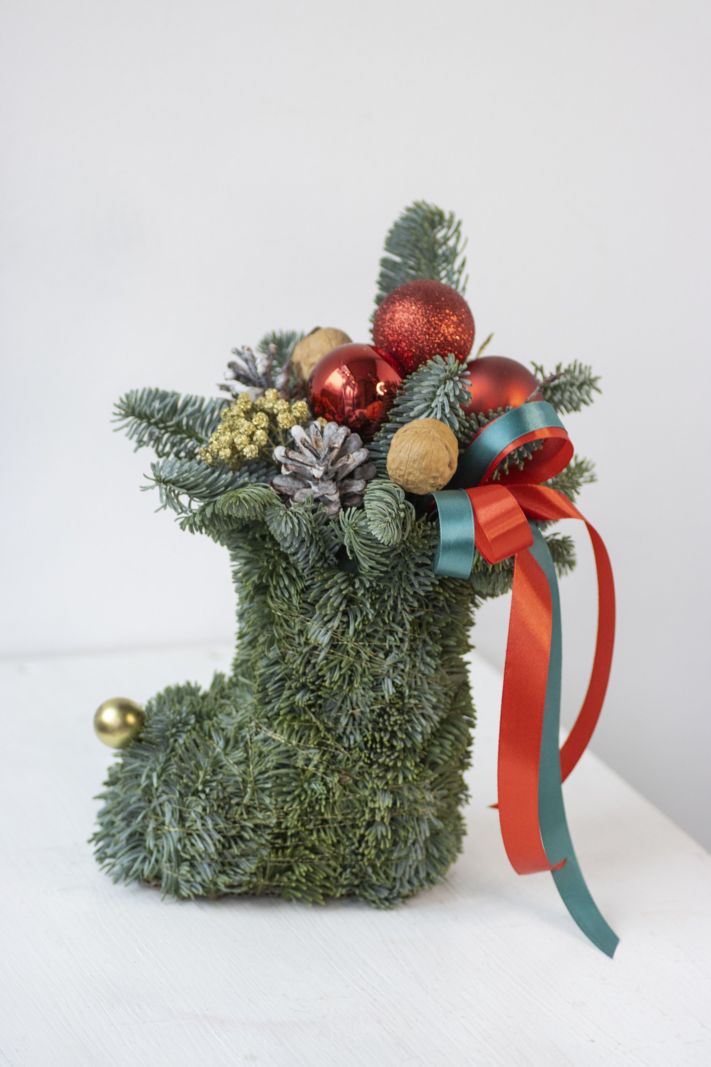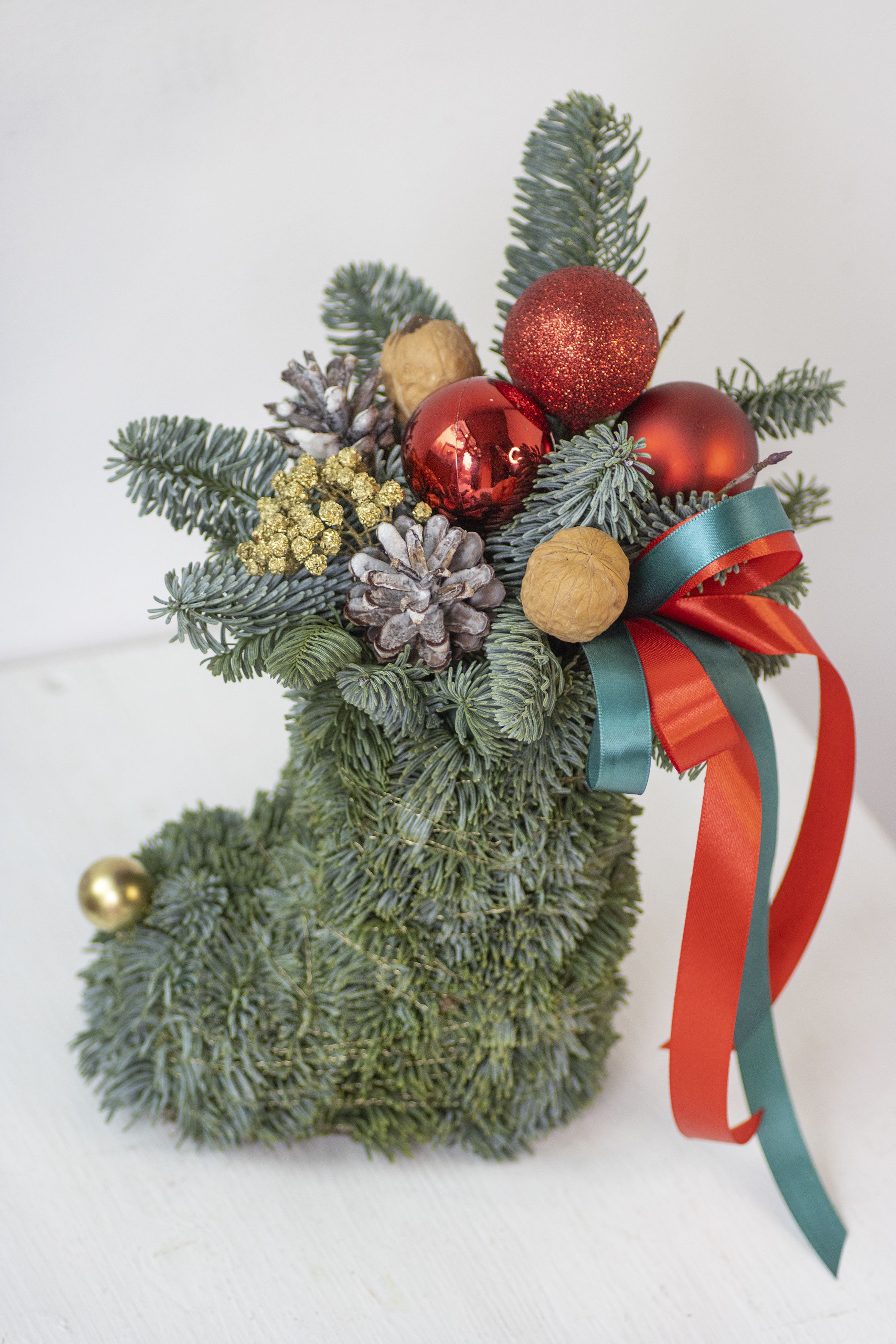 В новогодней композиции из нобилиса вы найдёте сочетание насыщенных красных оттенков и разнообразие новогодних элементов: датскую ель нобилис, новогодние игрушки, свечу и другие декоративные элементы.