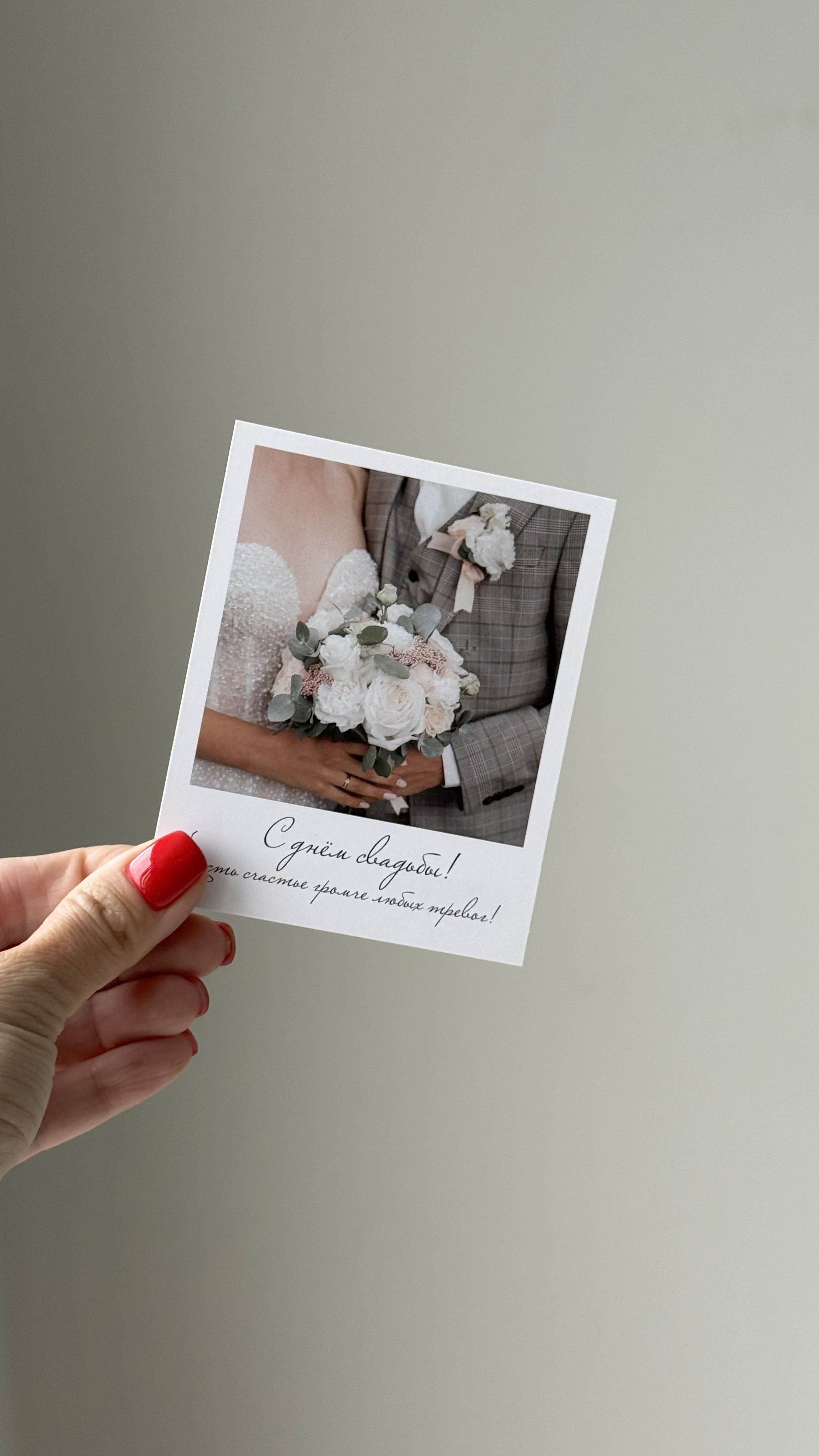 Открытка (полароид) "С днём свадьбы! Пусть счастья громче любых тревог"!