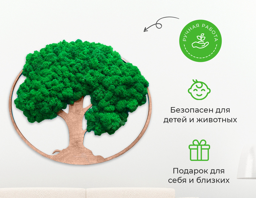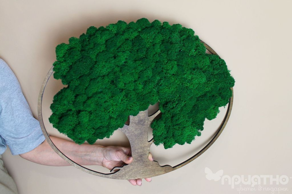 ? Без аллергии. Безопасен для детей Фитокартины — это популярный способ использования стабилизированного мха. Они представляют собой деревянные рамы со мхом внутри и выглядят очень натурально. Такие картины станут прекрасным украшением любого помещения.