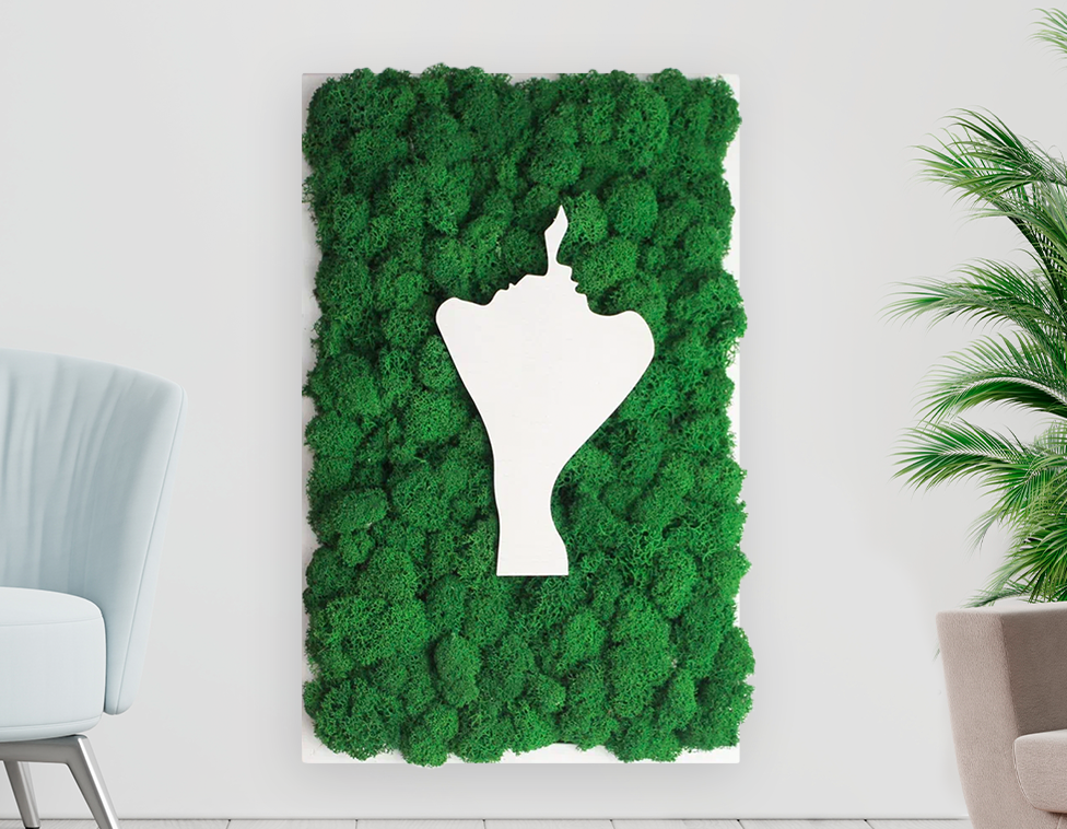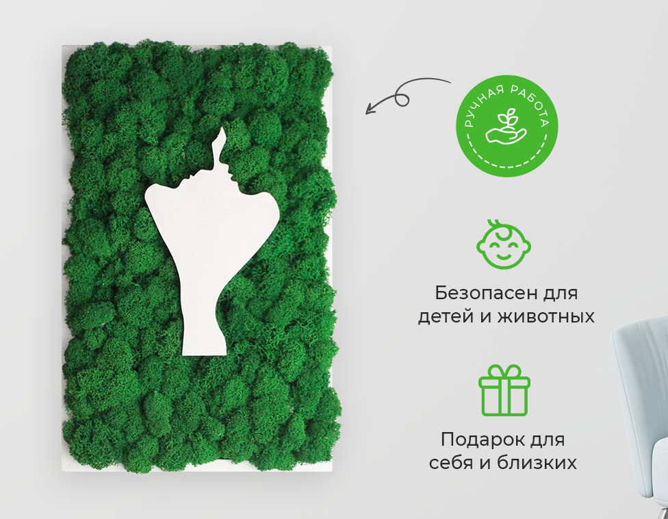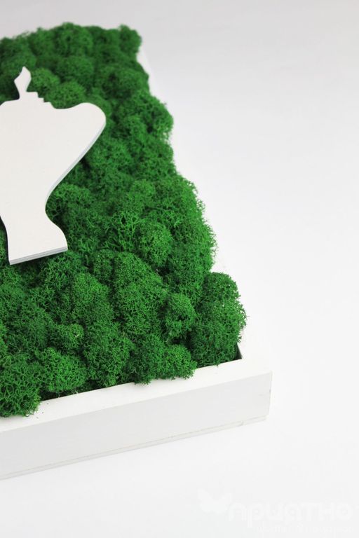 Стабилизированный мох, которым оформлена внутренняя часть рамы, не требует ухода и сохраняет свой внешний вид на протяжении нескольких лет. Благодаря разнообразию оттенков мха, можно подобрать картину, которая идеально впишется в любой интерьер.