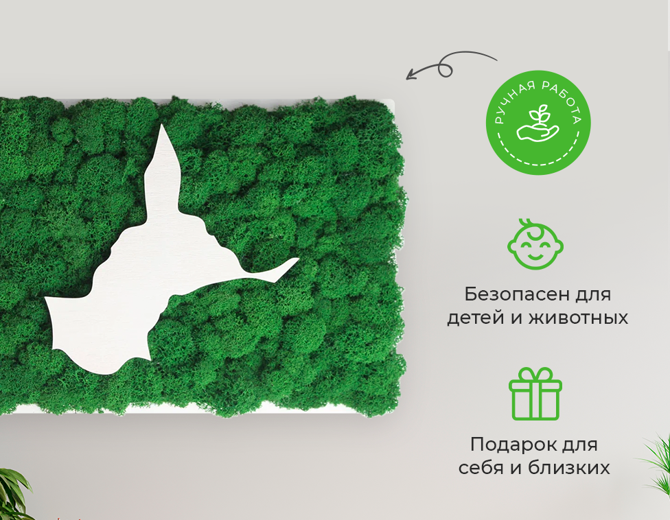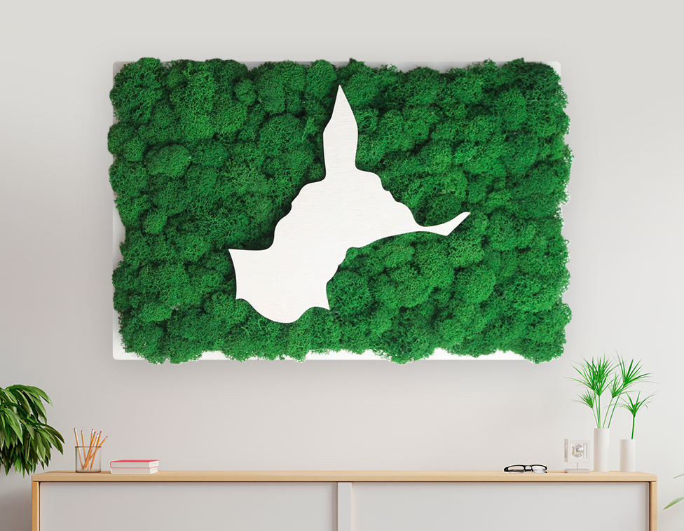 Стабилизированный мох, которым оформлена внутренняя часть рамы, не требует ухода и сохраняет свой внешний вид на протяжении долгого времени. Благодаря разнообразию оттенков мха, можно подобрать картину, которая будет гармонично смотреться в любом интерьере.