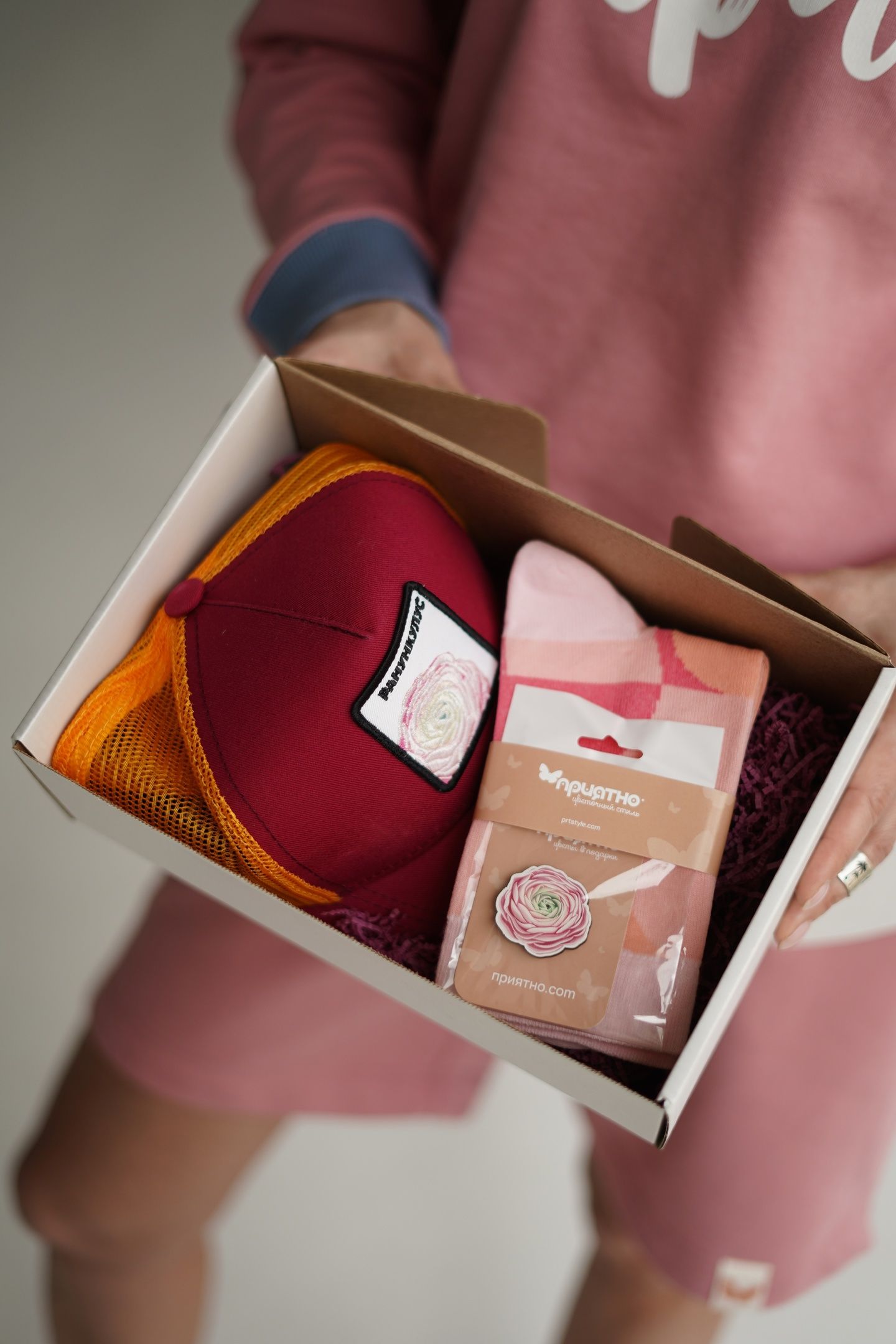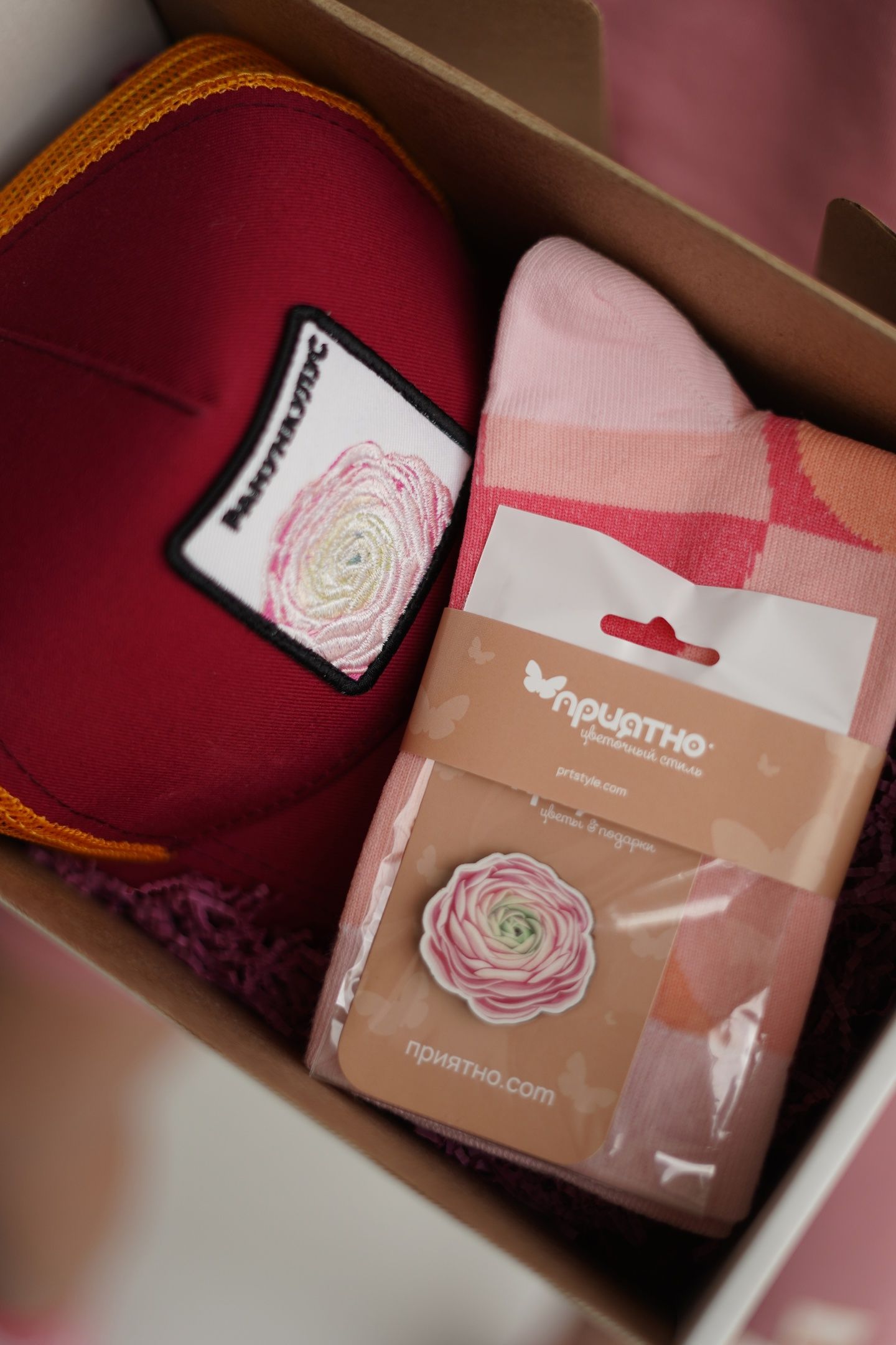 Набор для НЕЕ: пион, незабудка и ранункулюс (на выбор) – бейсболка с изображением нежных цветов , значок в виде цветка и пара носков с нежным рисунком. Будьте уверены, ваша вторая половинка оценит вашу заботу и внимание! Ранункулюс - это символ женского очарования и привлекательности, его часто выбирают в подарок утонченным и женственным девушкам.