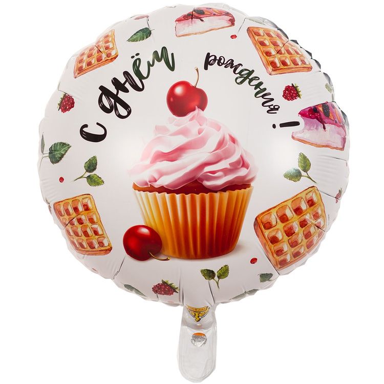 Фольгированный воздушный шар круг, ДР Капкейк с вишенкой, 46 см