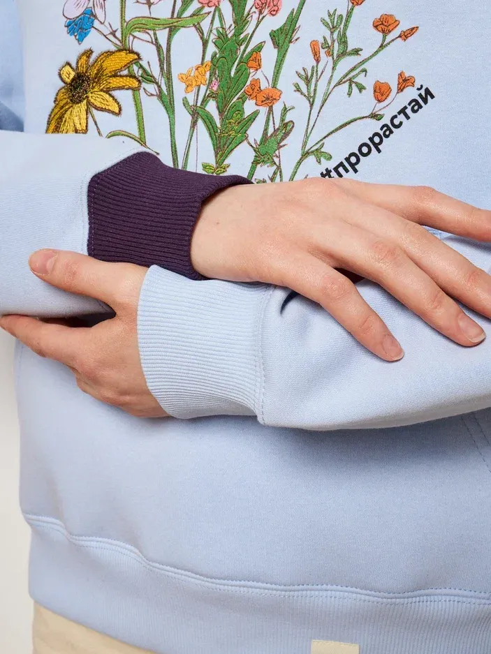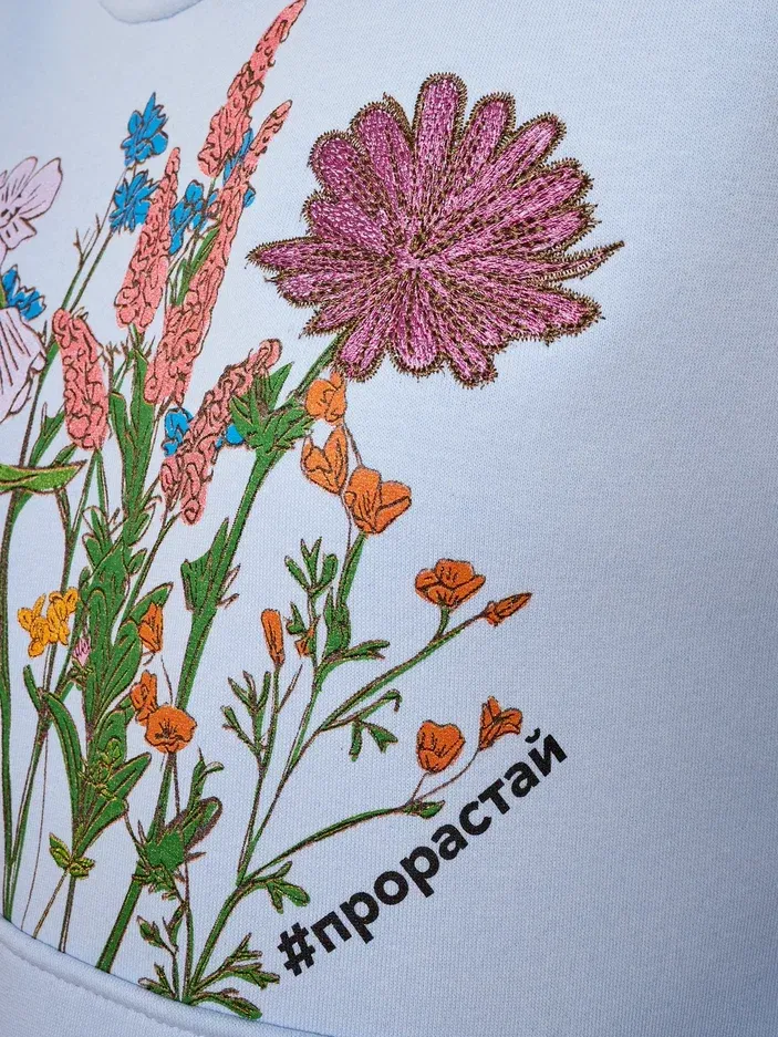 Уникальные элементы - авторский цветочный дизайн со слоганом #прорастай , необыкновенные манжеты и нестандартные форматы размещения бренда на одежде.
