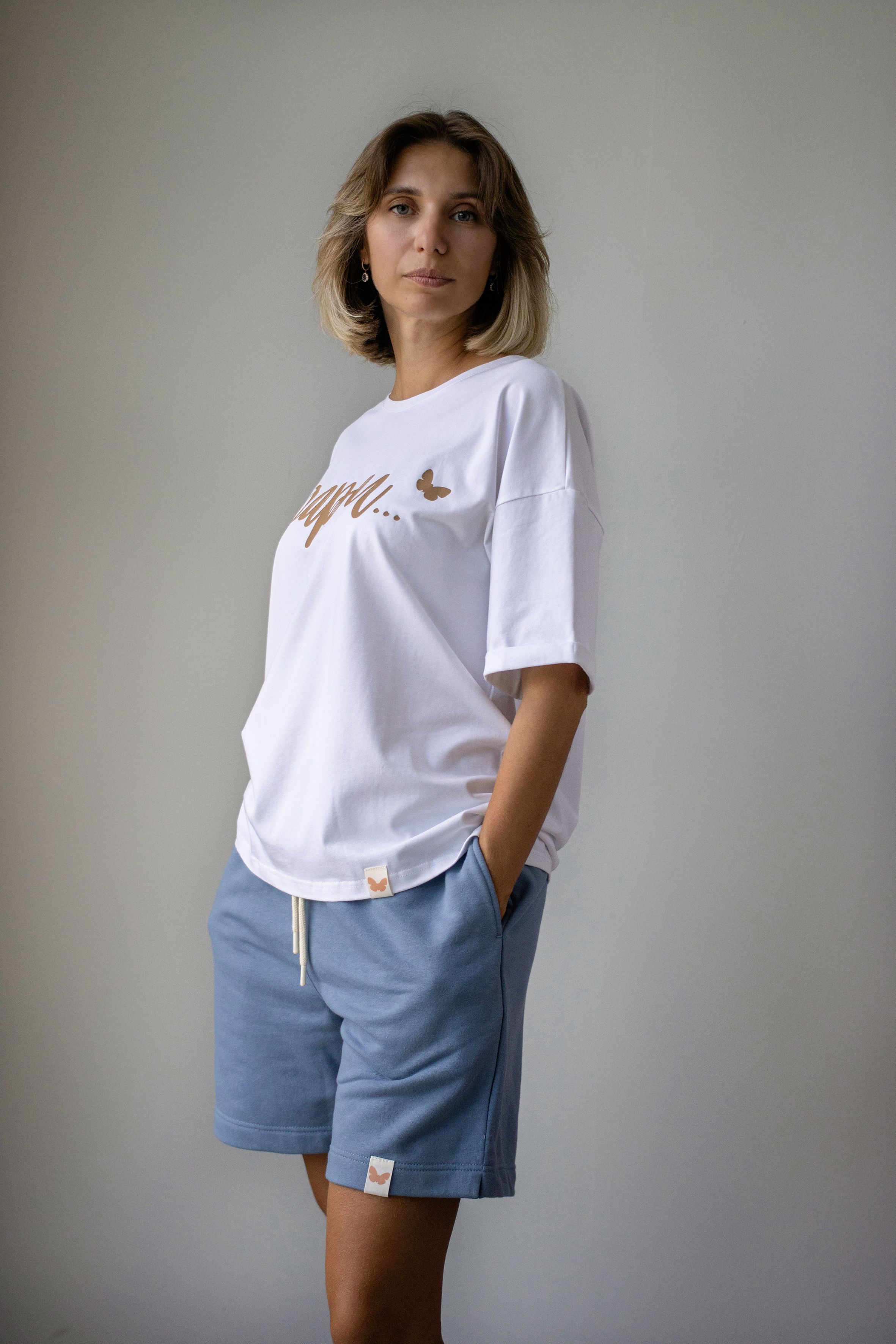 Белый цвет футболки и насыщенный синий цвет шорт создают стильный и удобный образ, который подойдёт для любой ситуации.