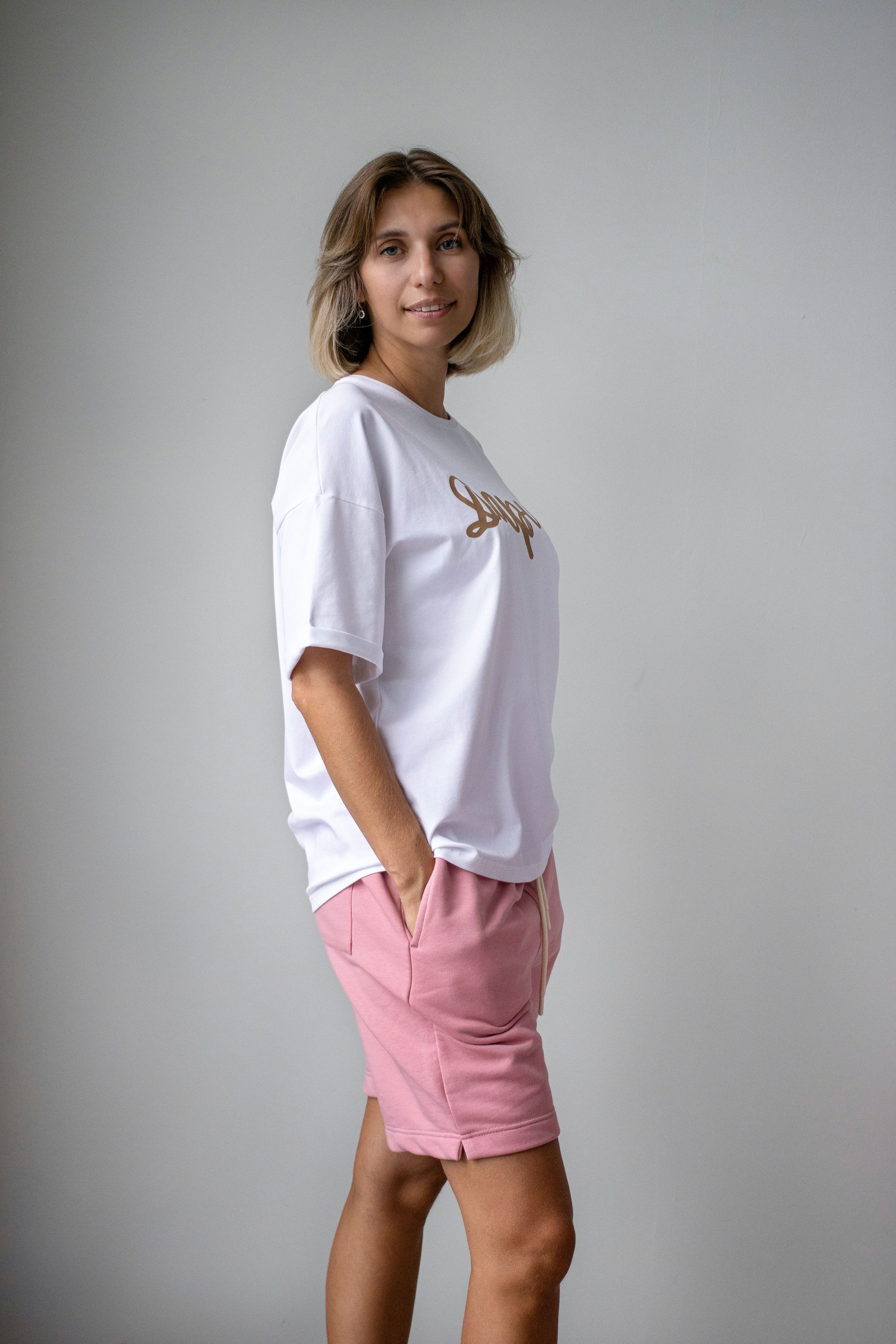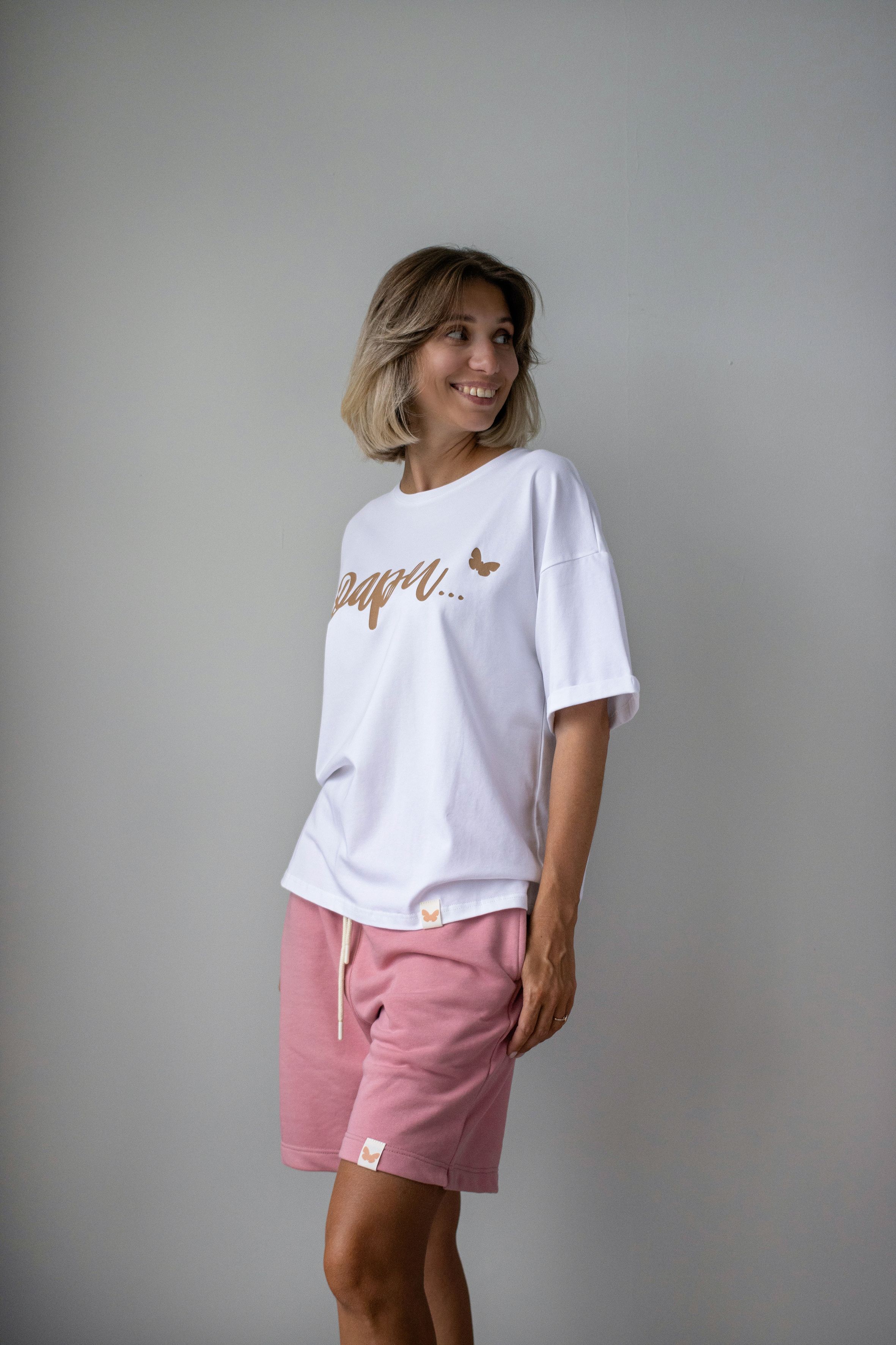 Женский костюм бело-розового цвета —идеальный выбор для тех, кто ценит комфорт и стиль. Он состоит из футболки оверсайз и шорт, что делает его универсальным решением для любого случая.