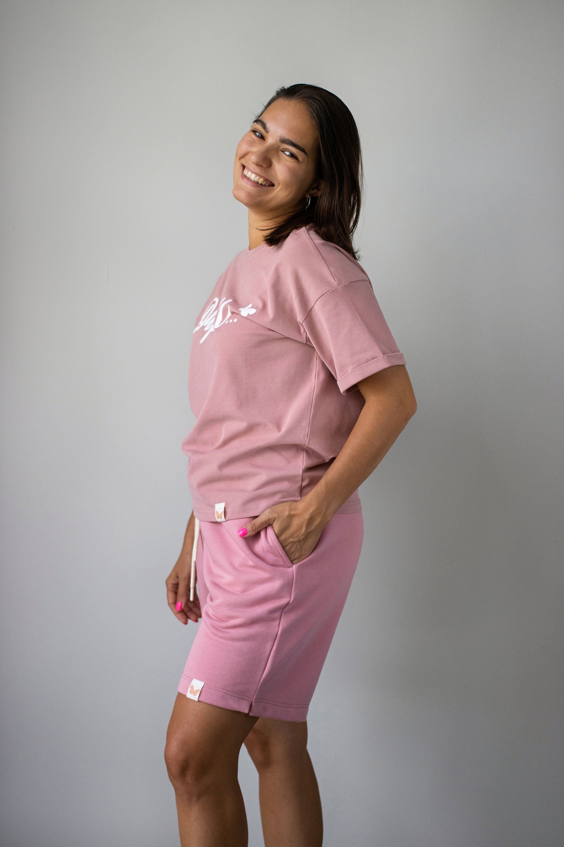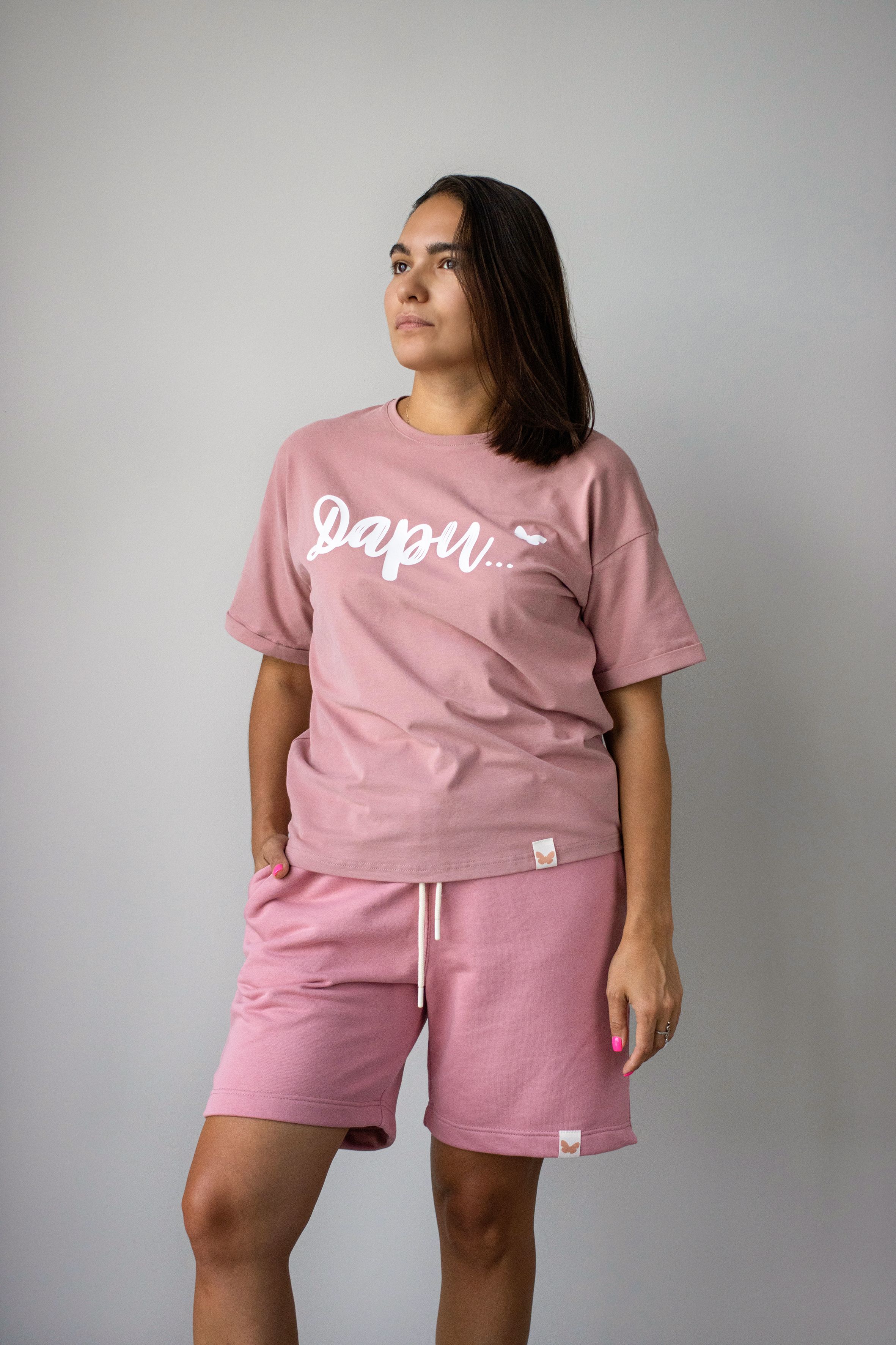 Элегантный и удобный женский костюм нежно-розового оттенка, включающий футболку оверсайз и шорты. Этот многофункциональный наряд отлично подойдет как для ежедневного использования, так и для занятий спортом на свежем воздухе.