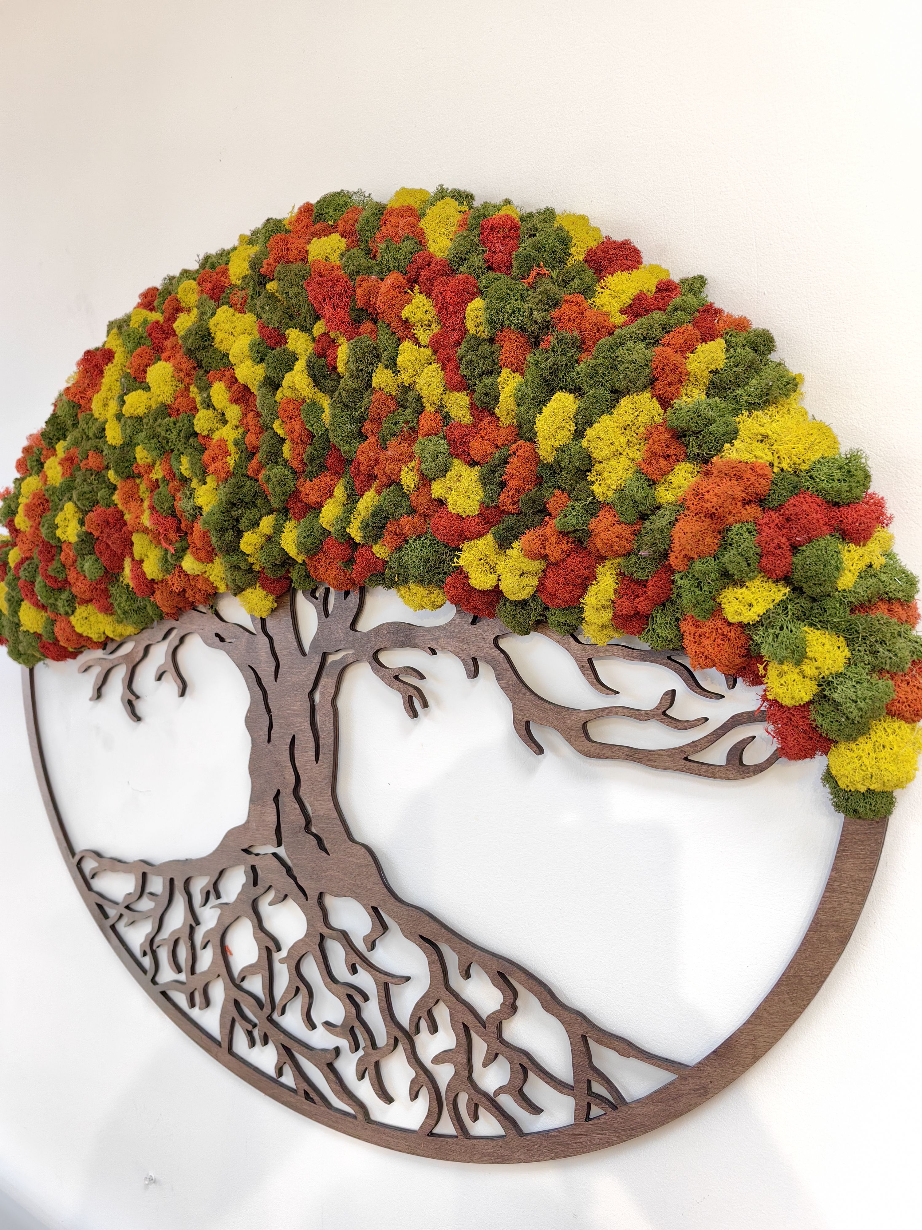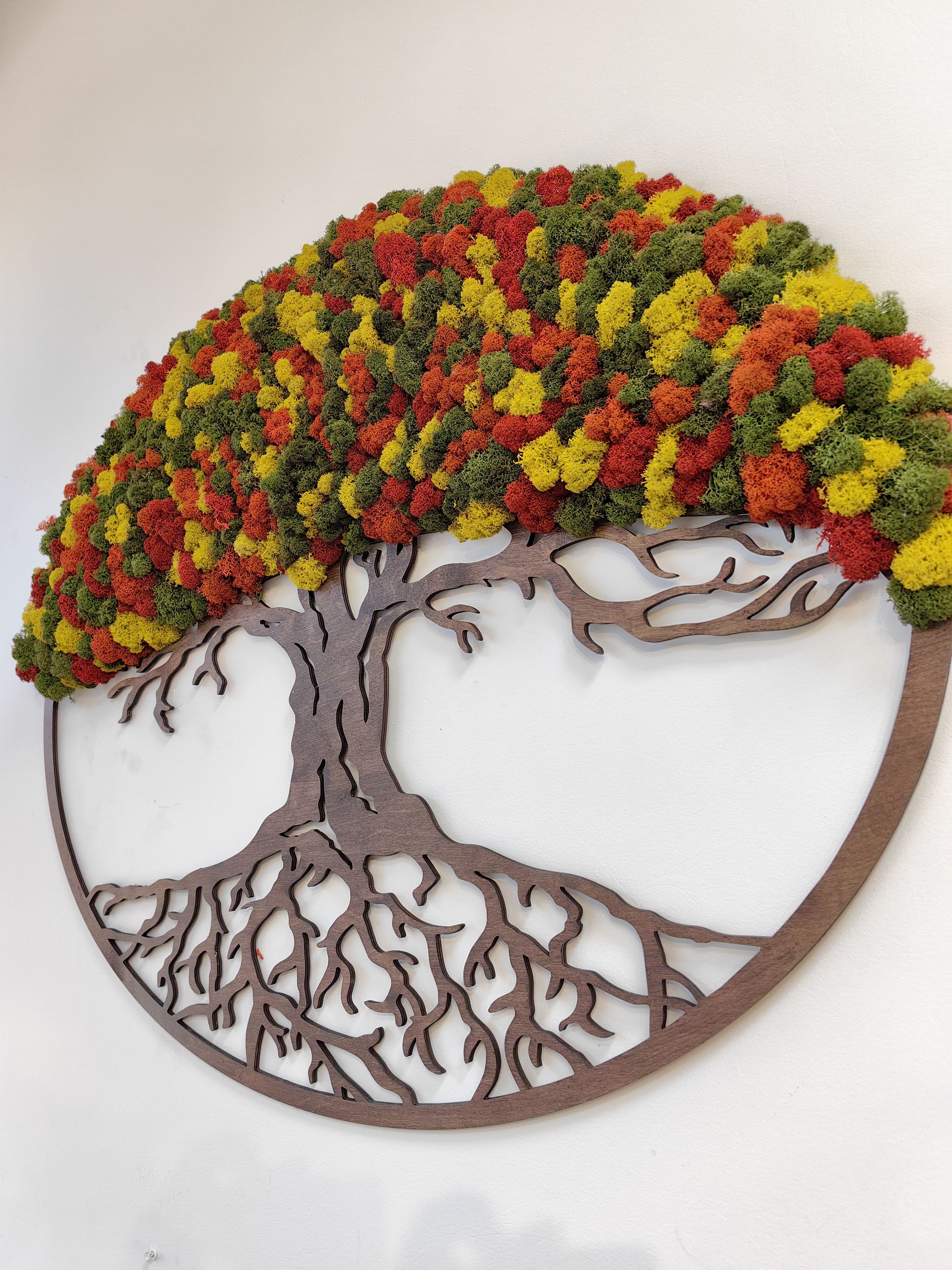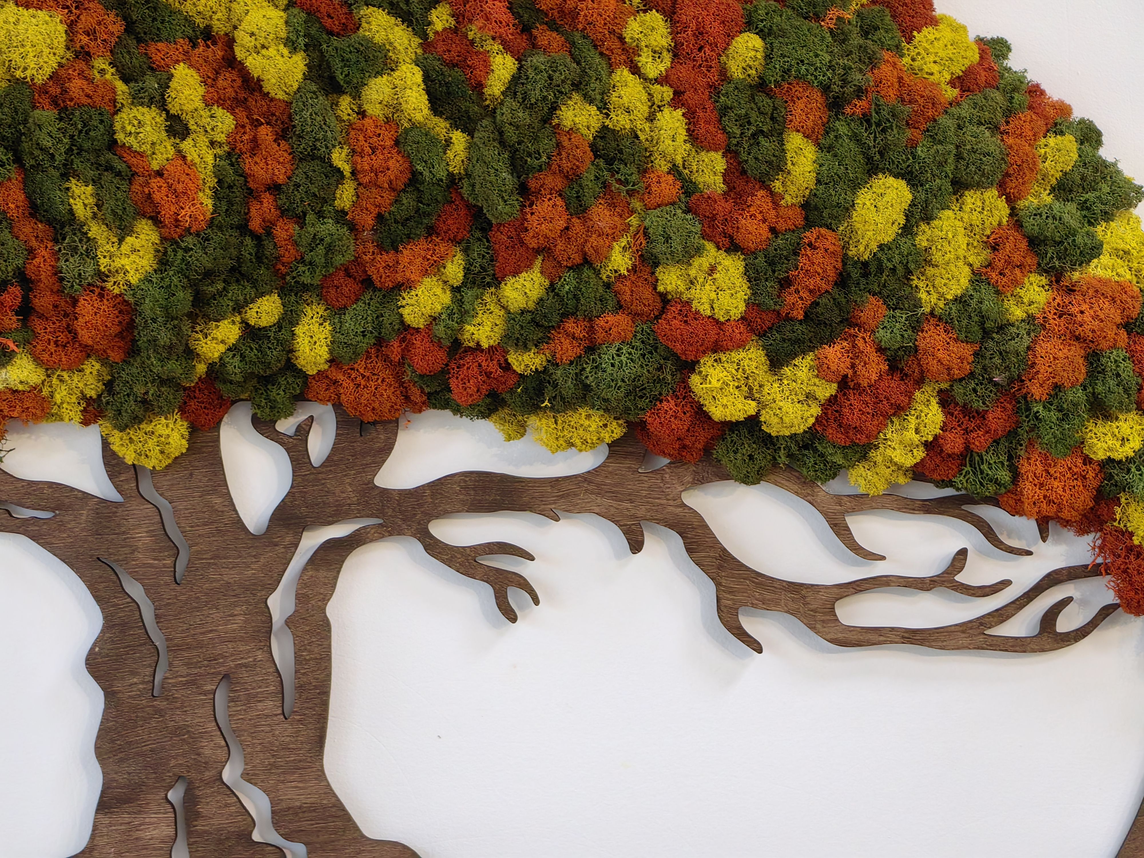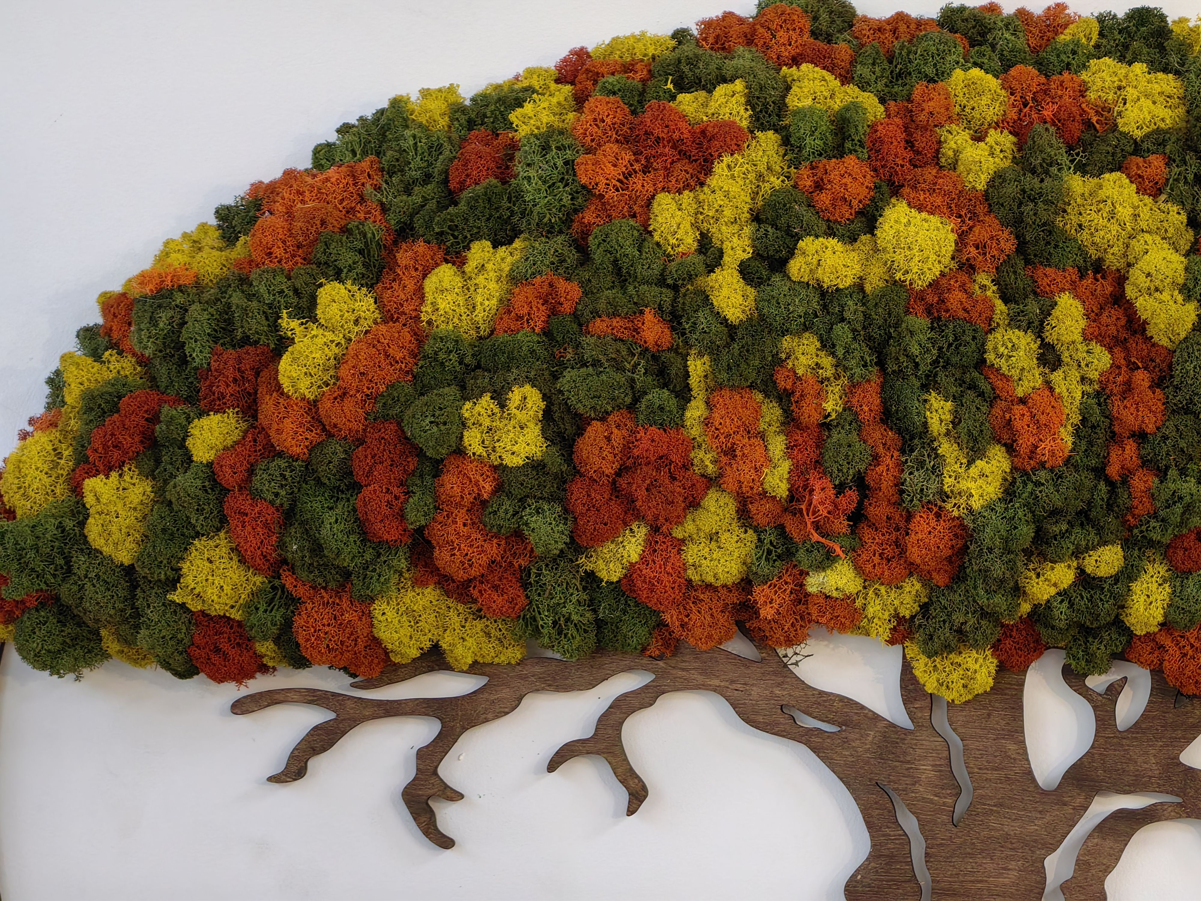 Особенно эффектно смотрятся фитокартины в виде деревьев с яркими красками. Красно-зелёно-жёлтые оттенки создают ощущение тепла и уюта, а также добавляют интерьеру свежести и оригинальности.